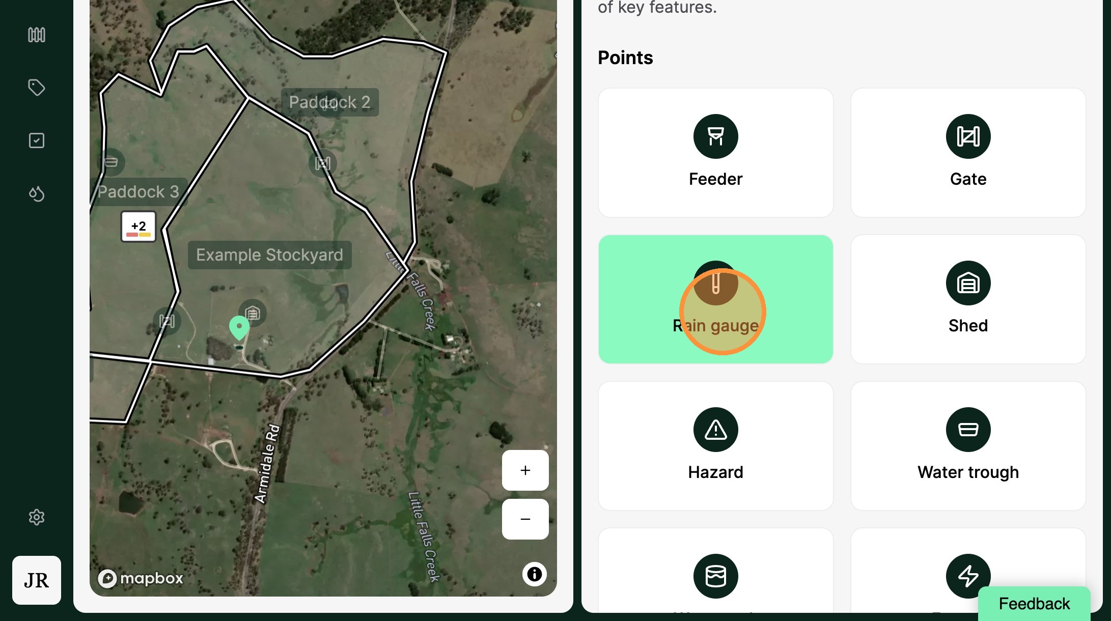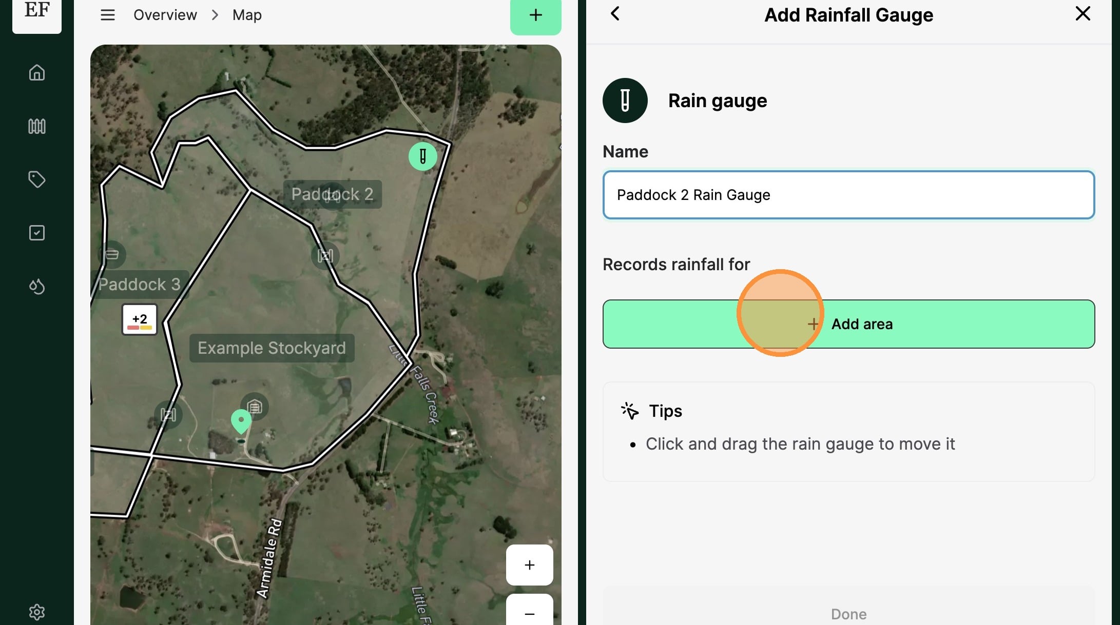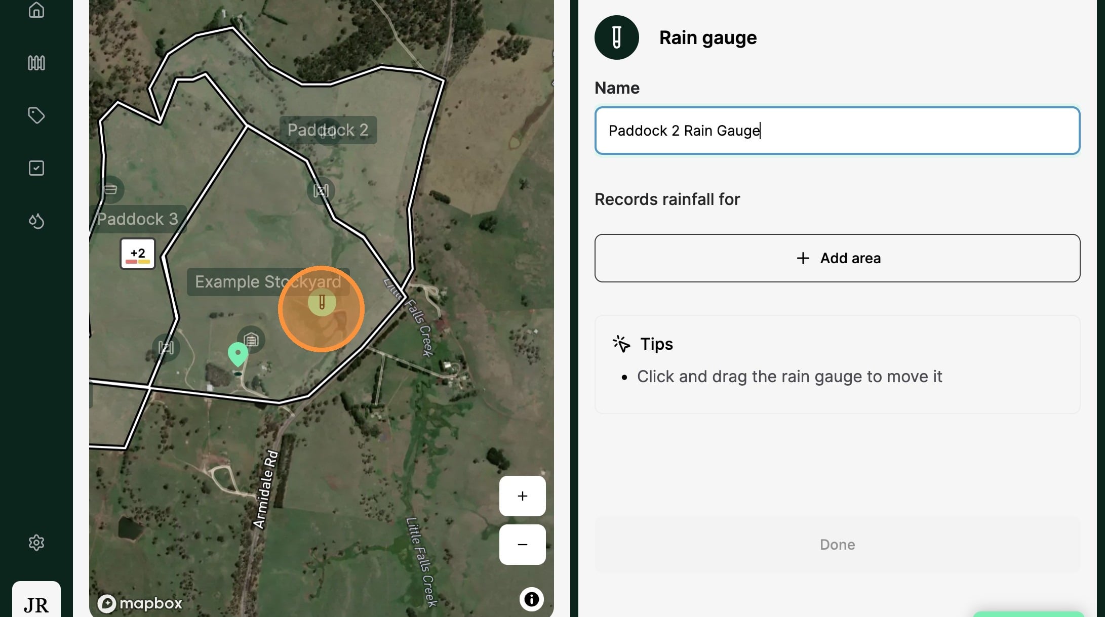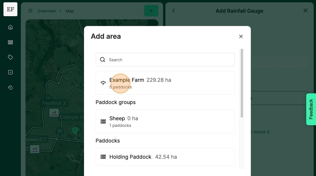 7. Select from existing paddock groups, individual paddocks or stockyards the rain gauge is located in