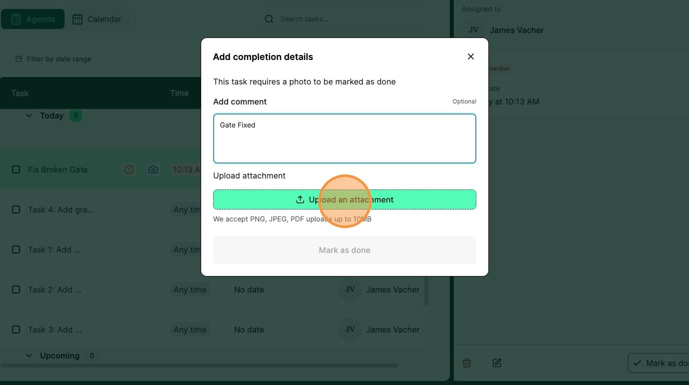 4. If a task requires a photo on completion, The photo attachment becomes a compulsory field. Use the Comments field to add a text comment to the completion of a task.
