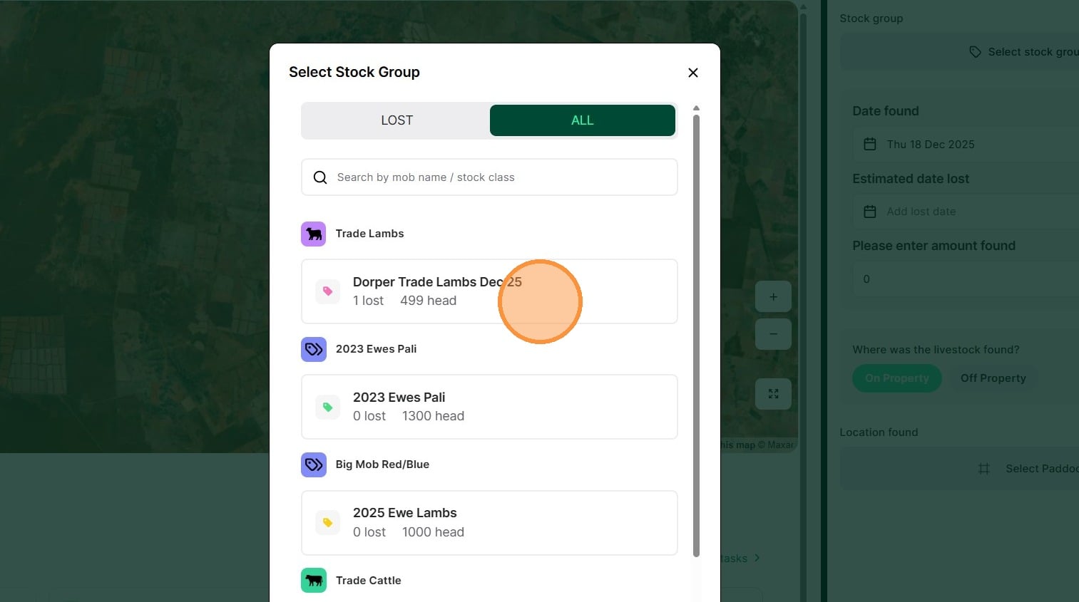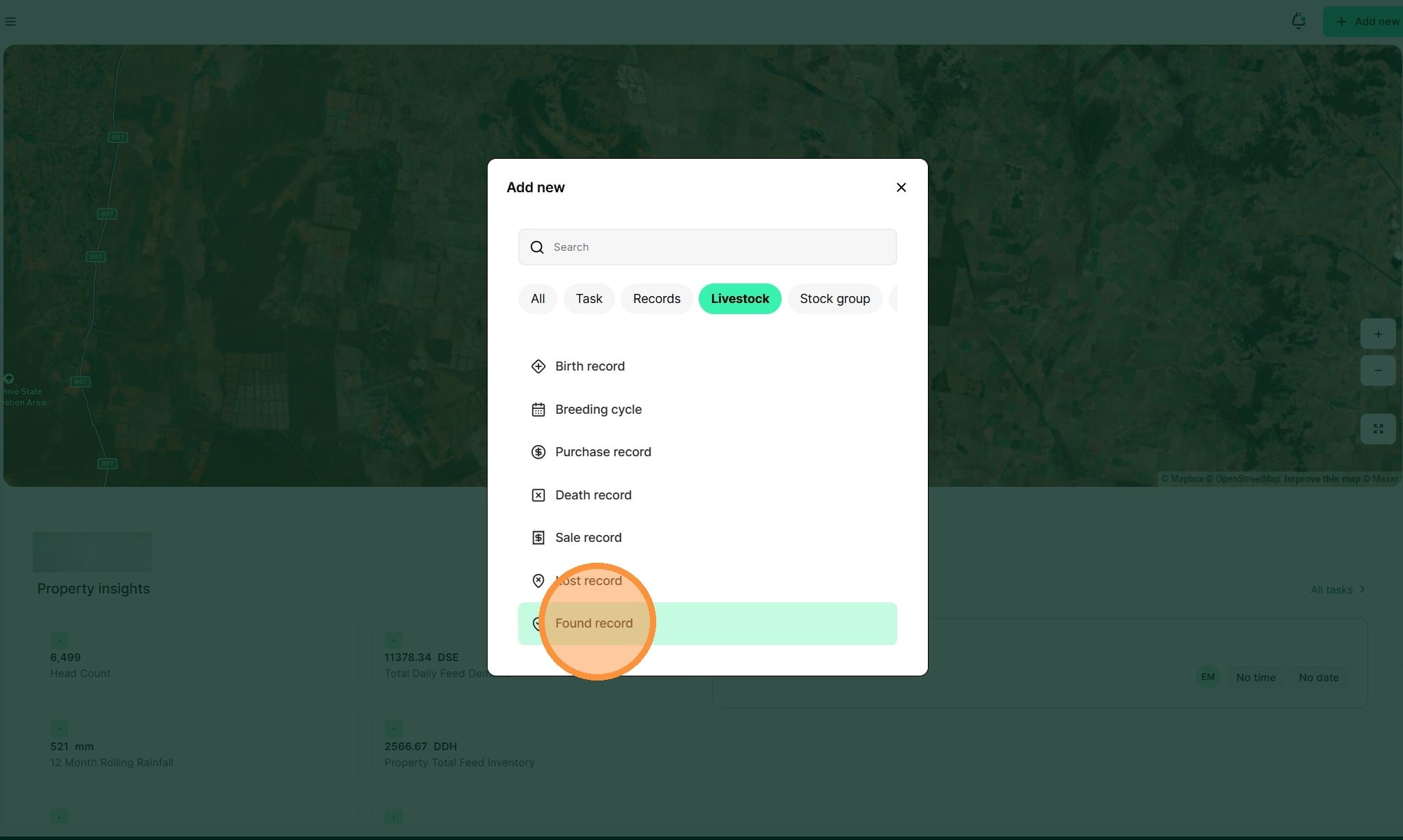 3. Select "Found record" under the Livestock category