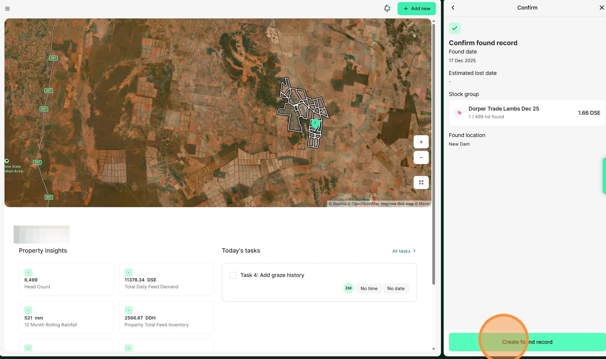 Tip: Keeping livestock inventory up to date for records and reporting is easy with Atlas Grazing. Found records are used when you need to increase the number of head in a mob from stock that is unexpectedly located on the property.