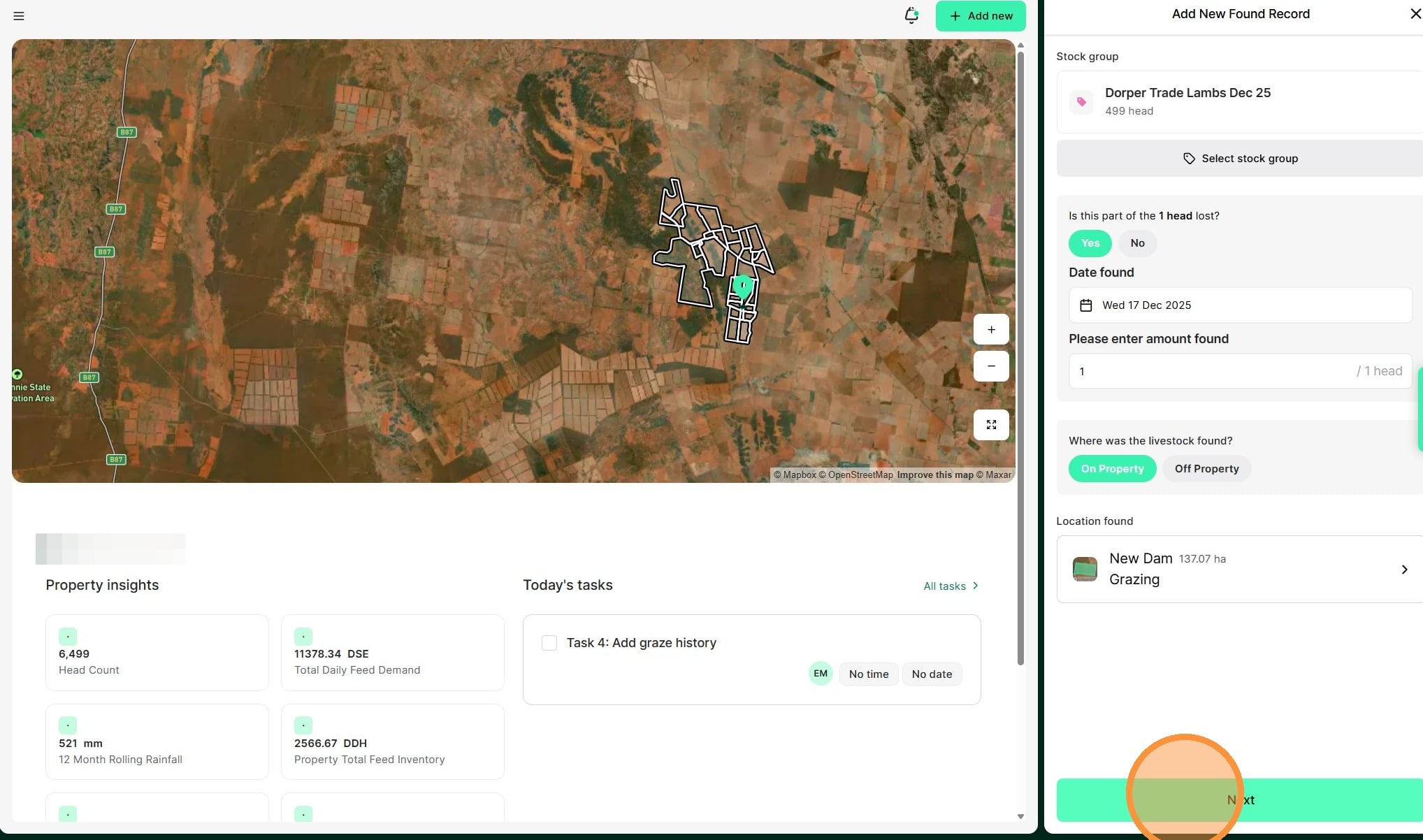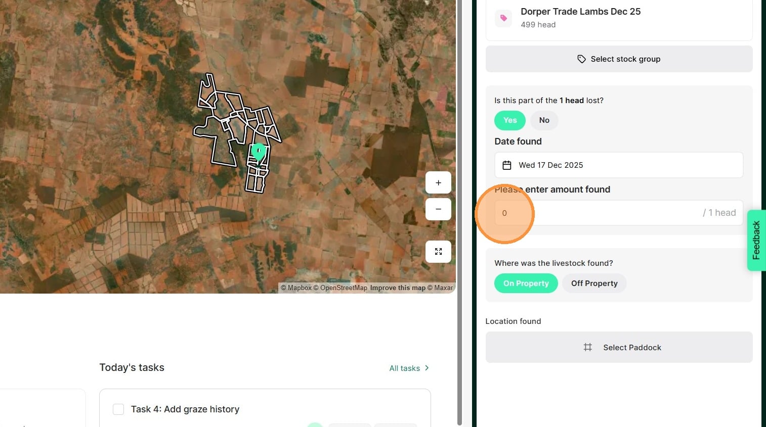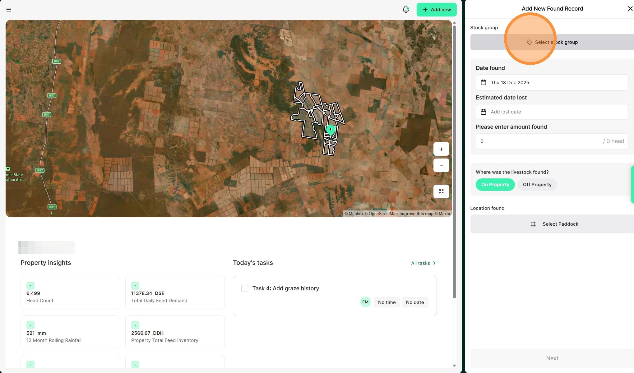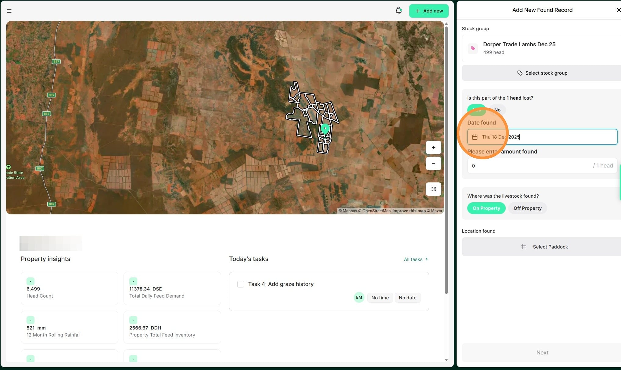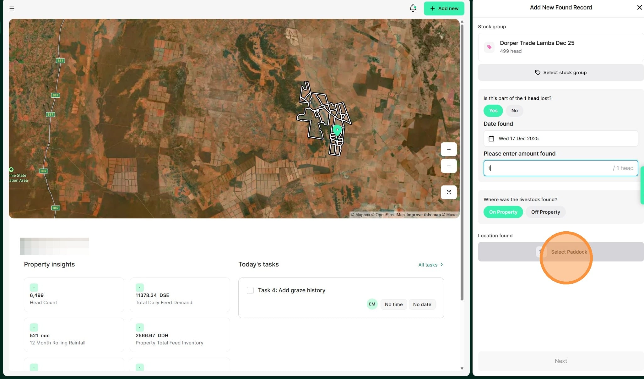 8. Select whether they were found "on or off property". If on property, select the relevant paddock."