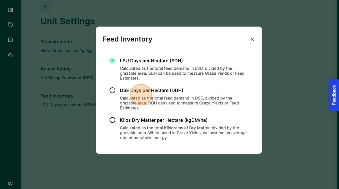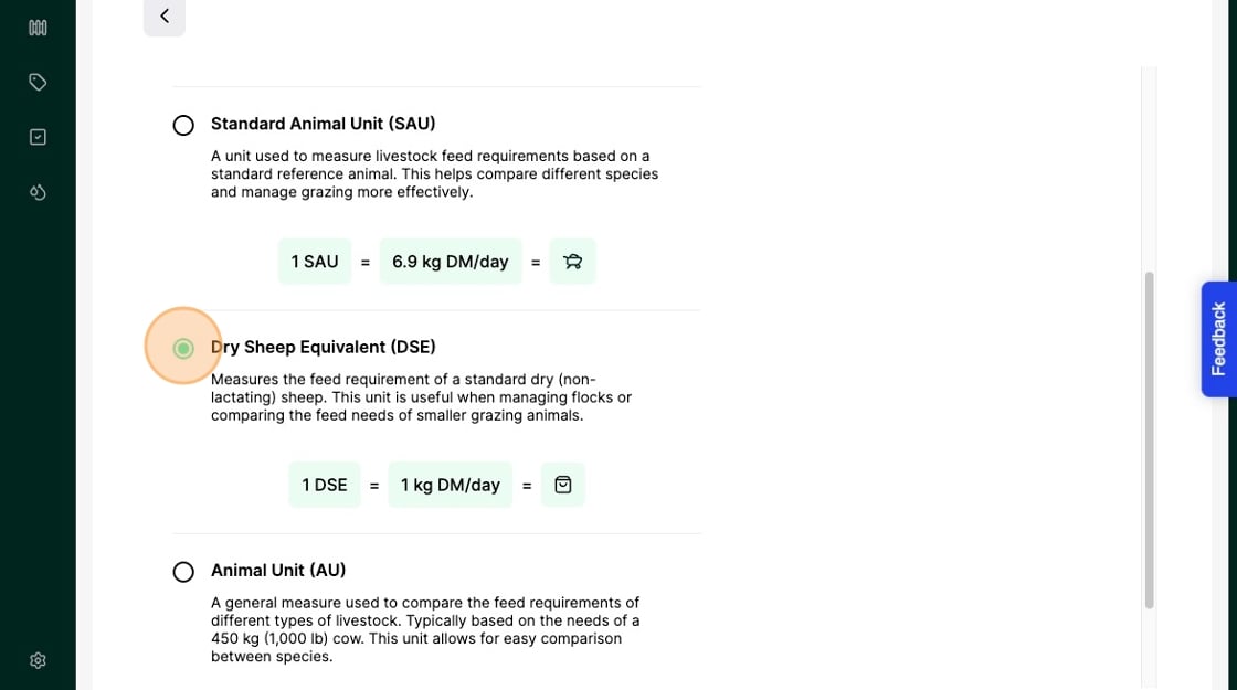 DSE or LSU? Sheep, Cattle, or something else? Configure your stock classes and units to match your what you use day to day. These units are used throughout the platform to consistently describe Feed Inventory, Animal Ratings and Area.