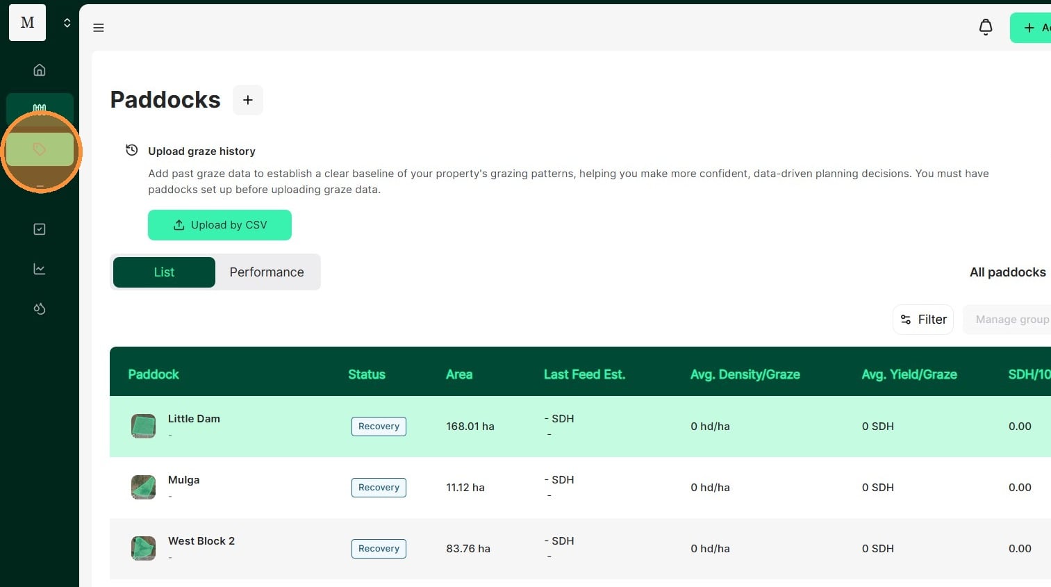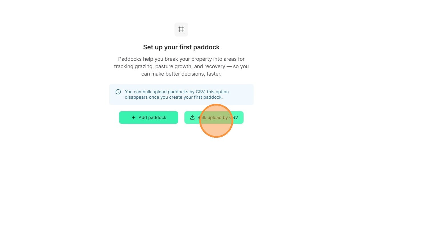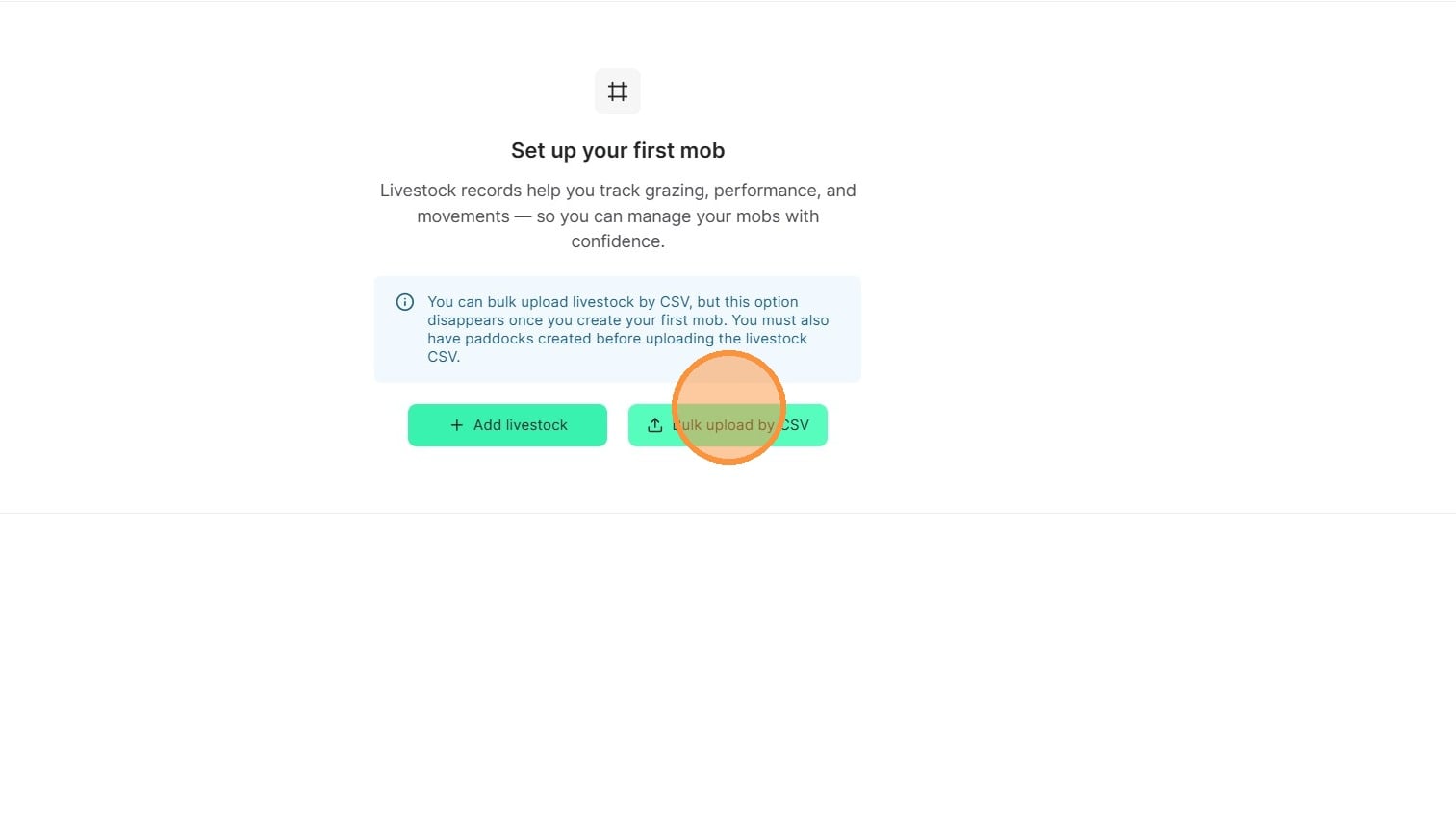 Please note: If you chose to manually draw paddocks and add mobs, you will lose the ability to bulk upload CSVs.