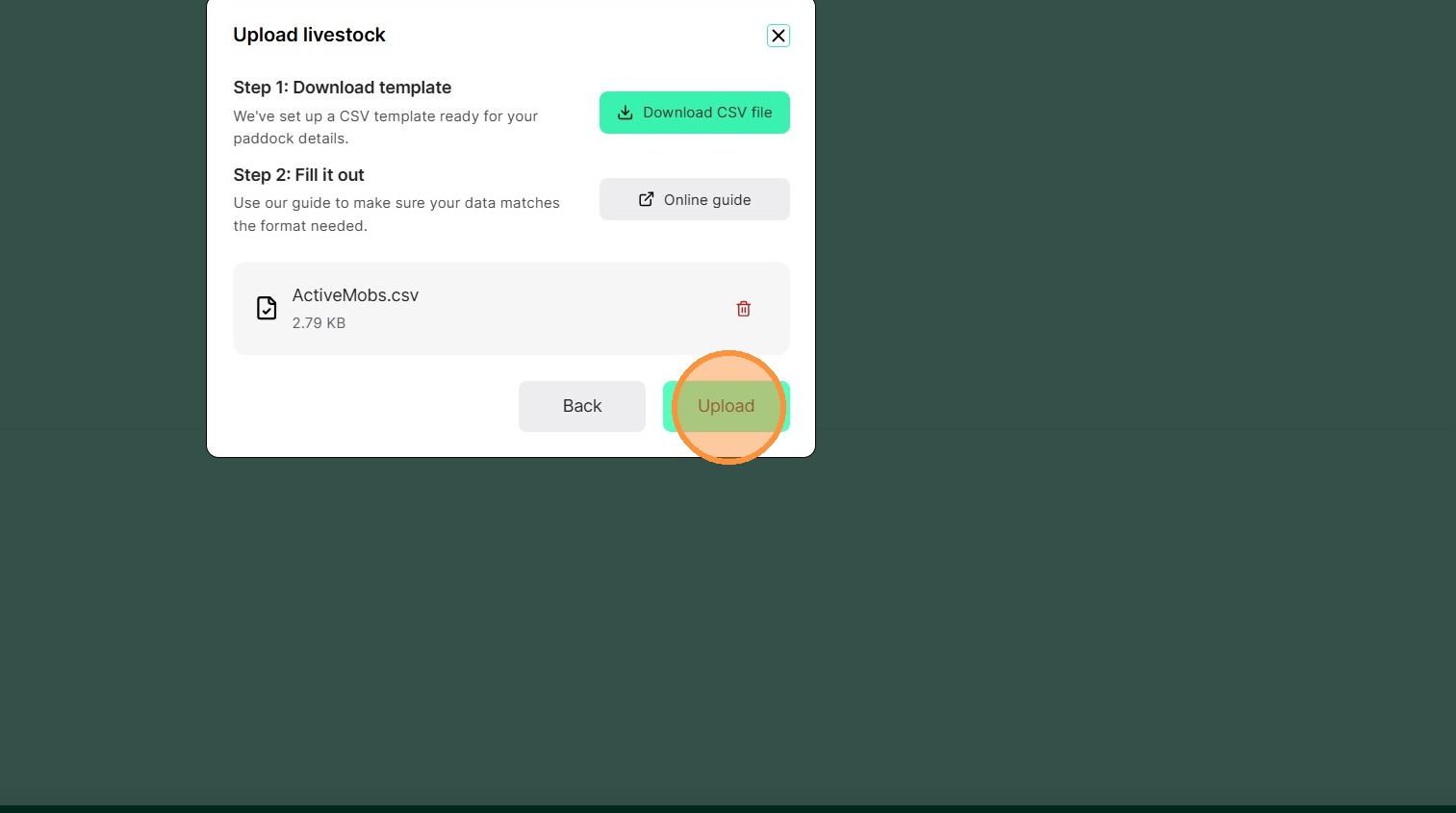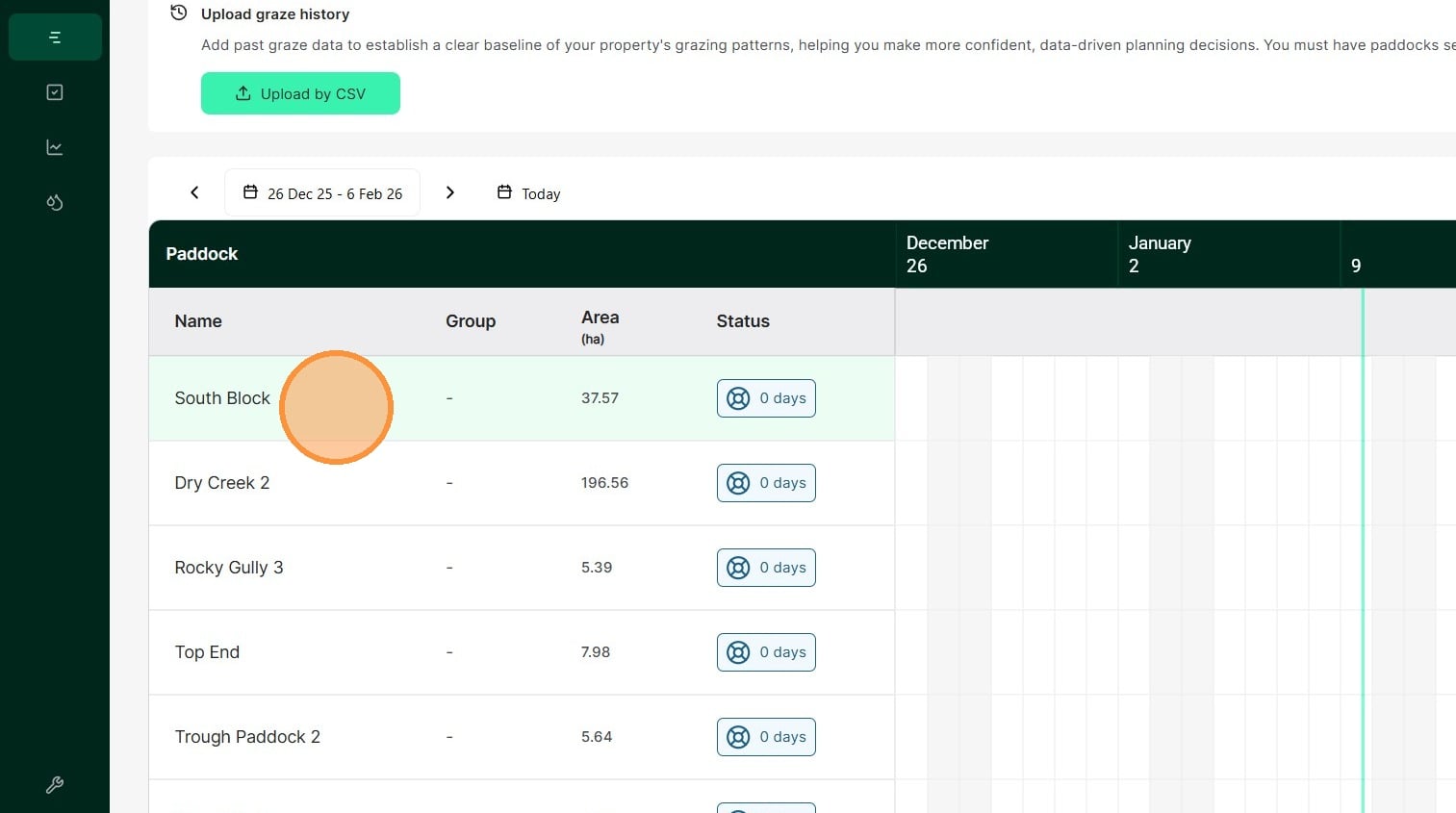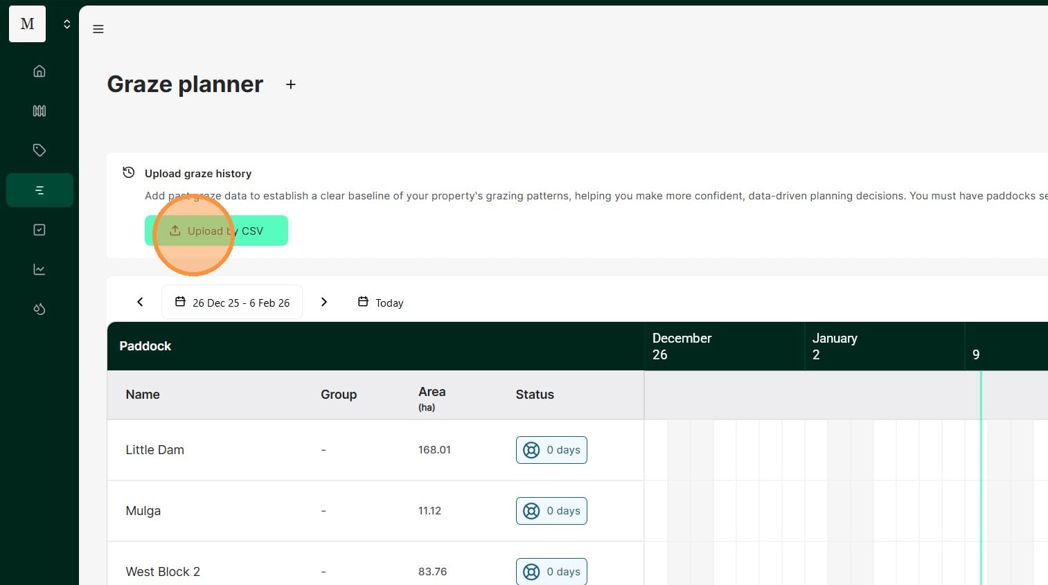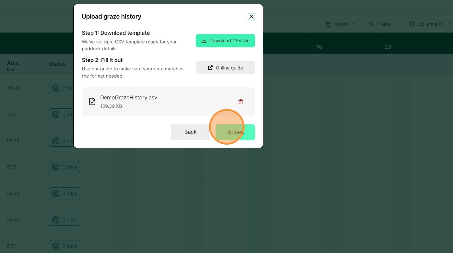 Download and fill out the CSV file for your paddocks, mobs, rainfall and graze history, then drag and drop the file into our bulk upload feature.