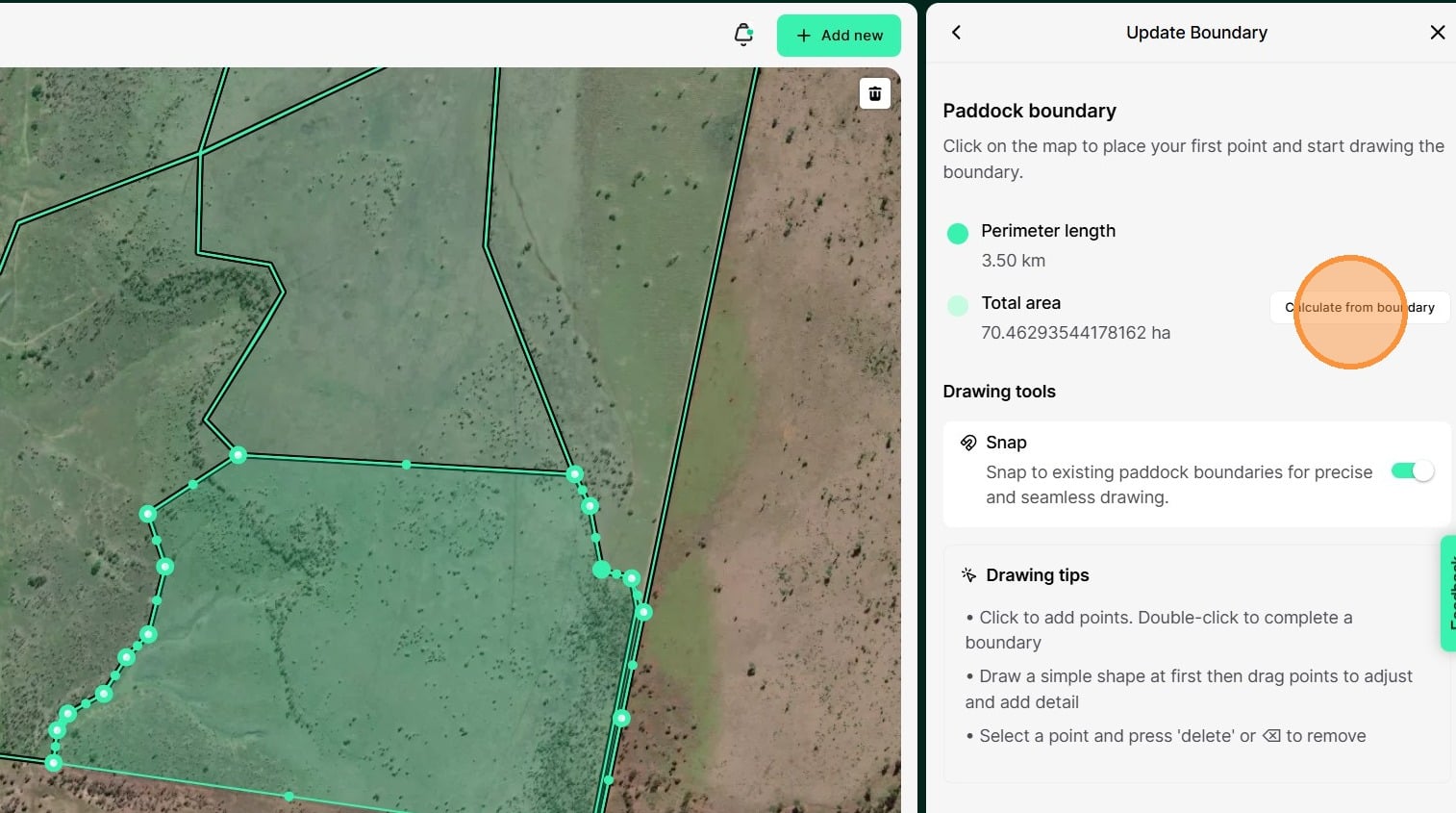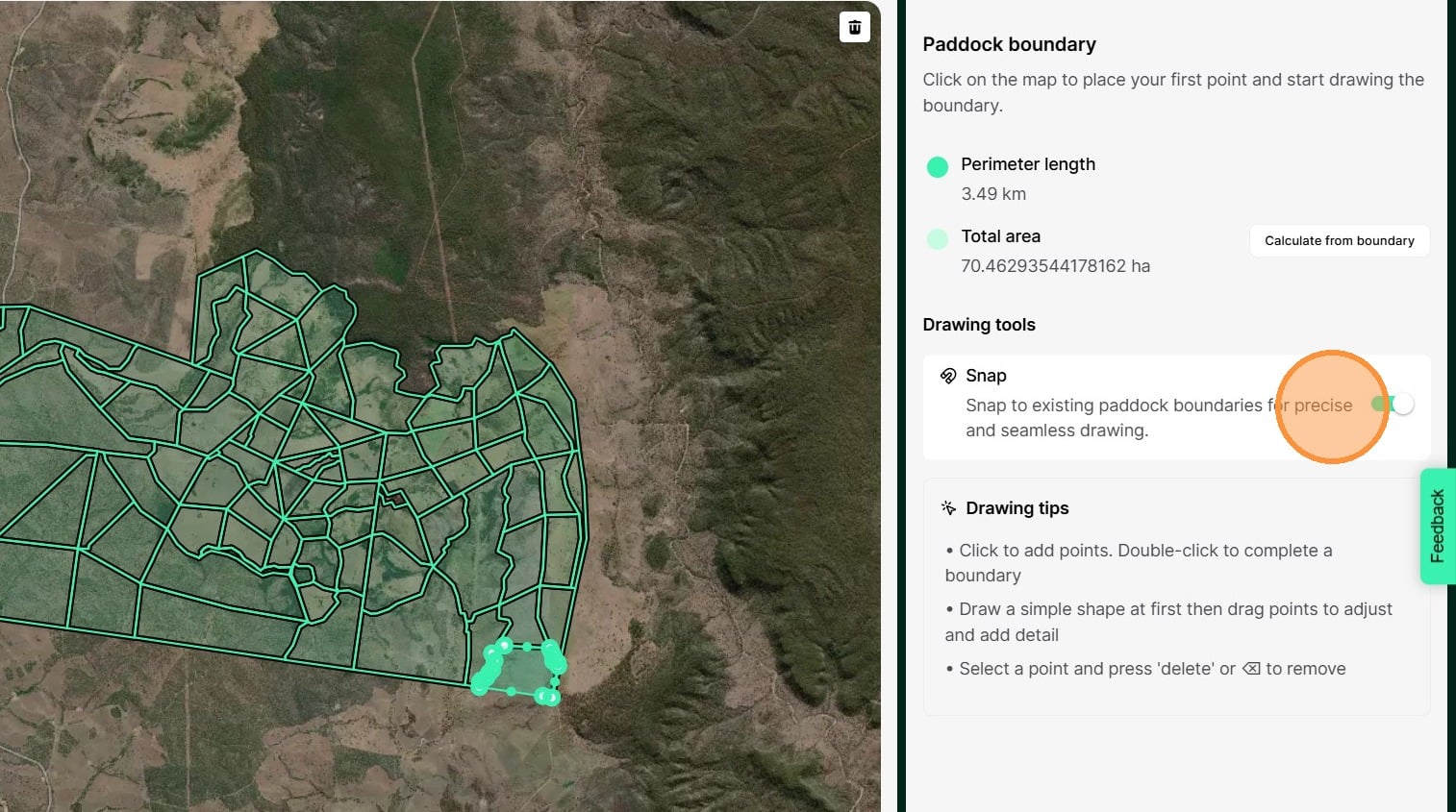 10. This will open the tool to edit or draw paddock boundaries. Turn on the 'Snap' tool so new boundaries will snap to existing boundaries for accurate mapping.