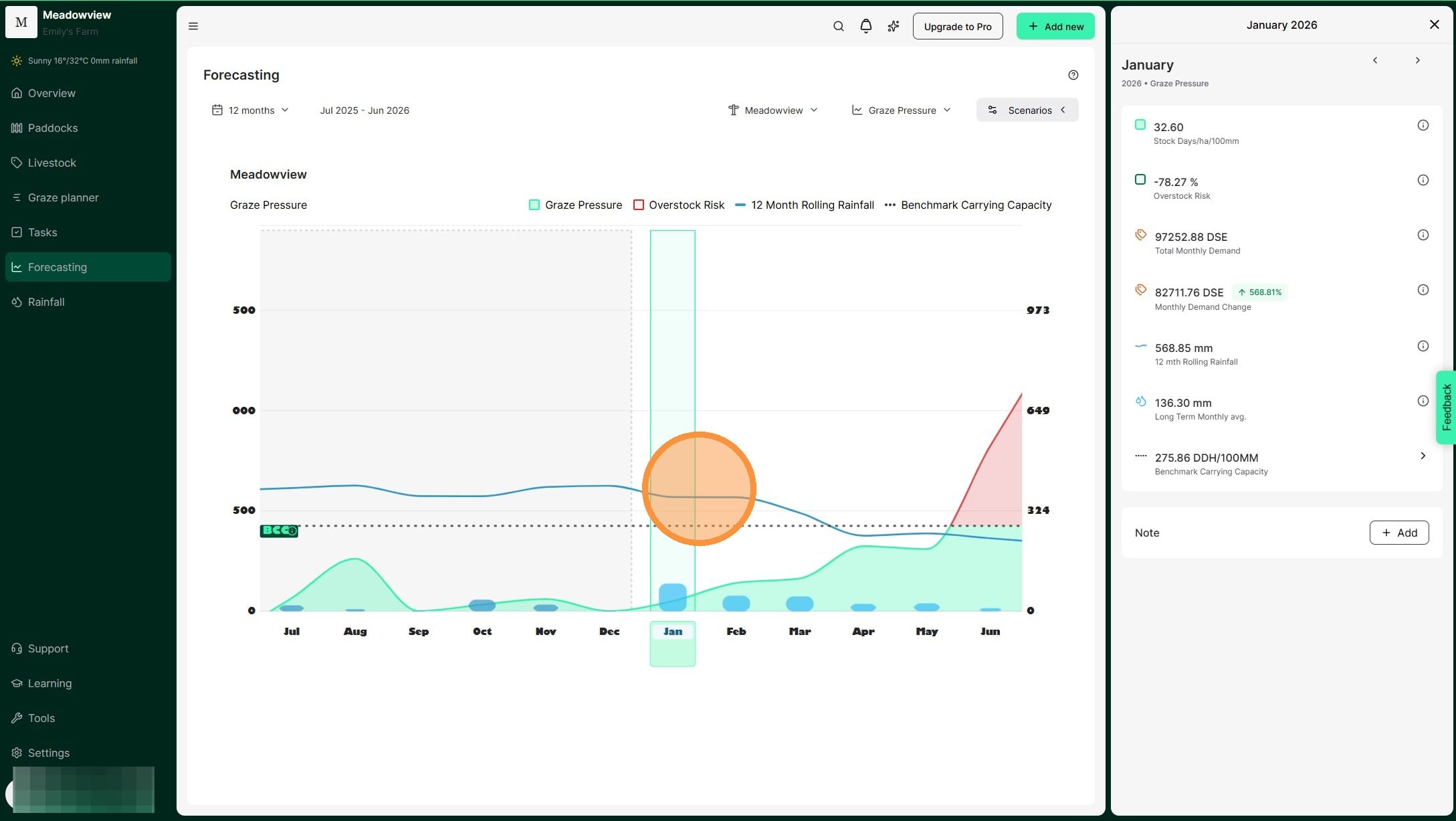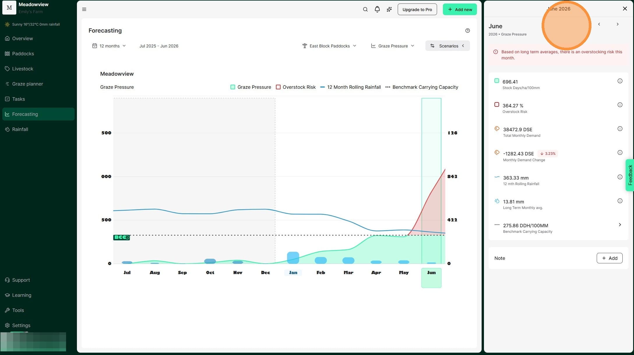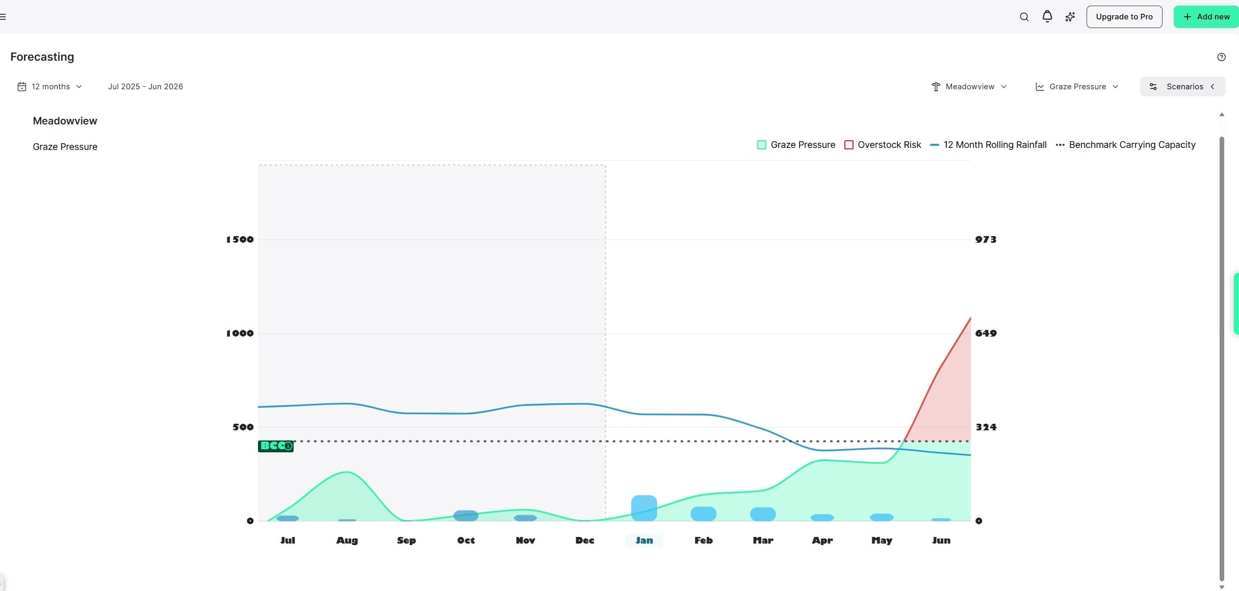 2. This will launch the forecasting graph. This chart represents your grazing pressure and forecasts your predicted grazing pressure given the trending stocking rate, and your long term average rainfall. It also compares your past actuals to help you identify when your land was at risk of stress from potential overstocking. It helps you understand your productivity and grass growth per 100mm or inch of rainfall.
