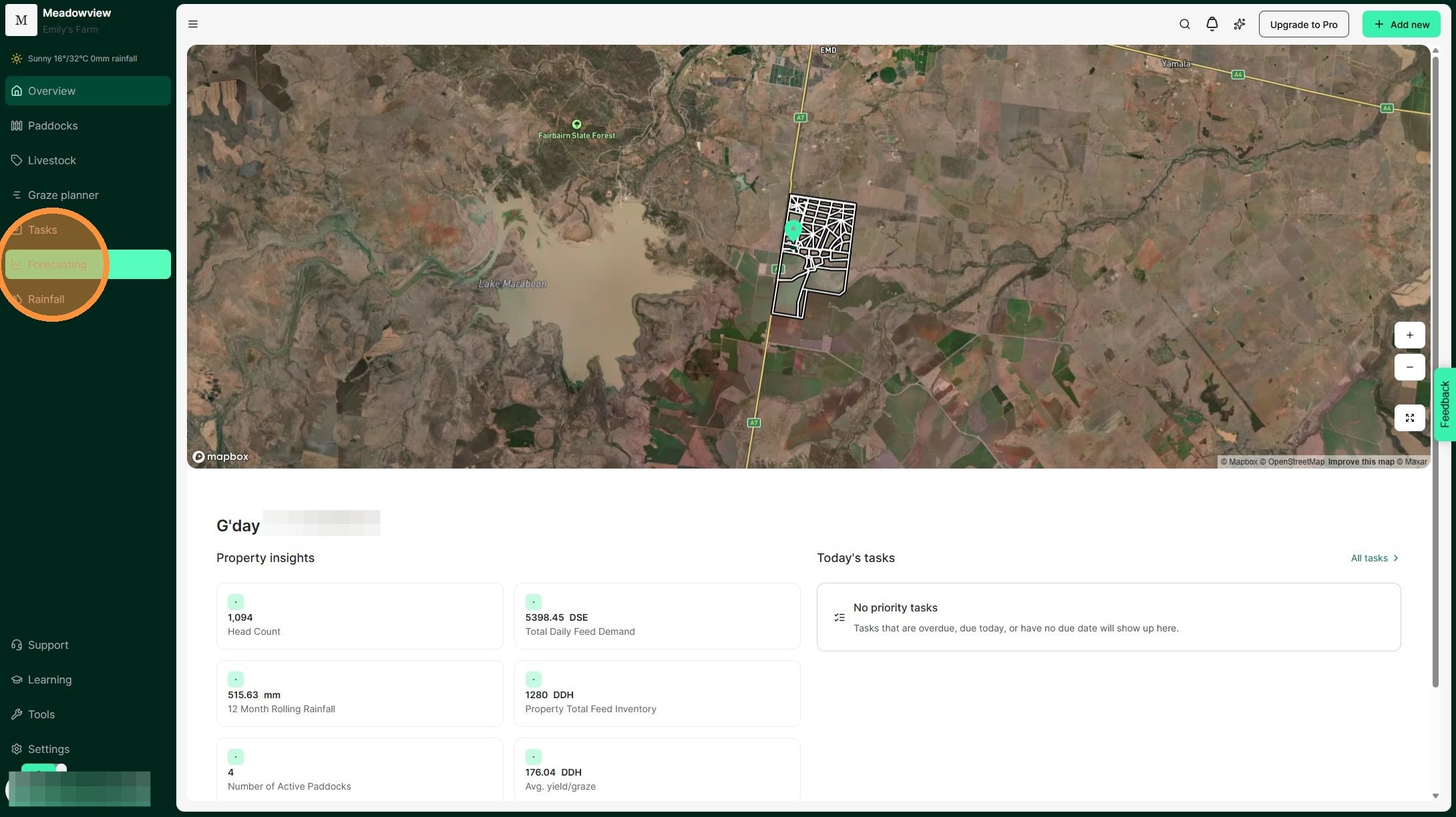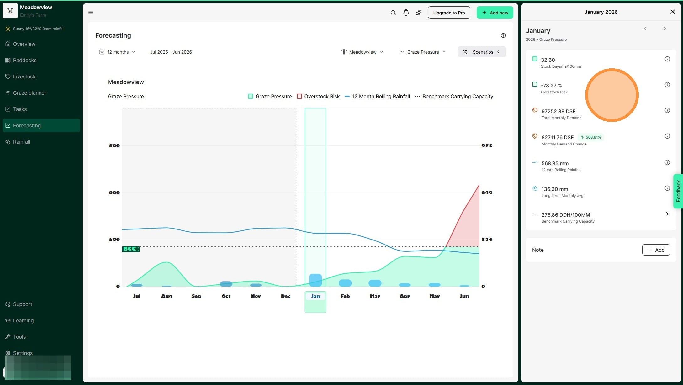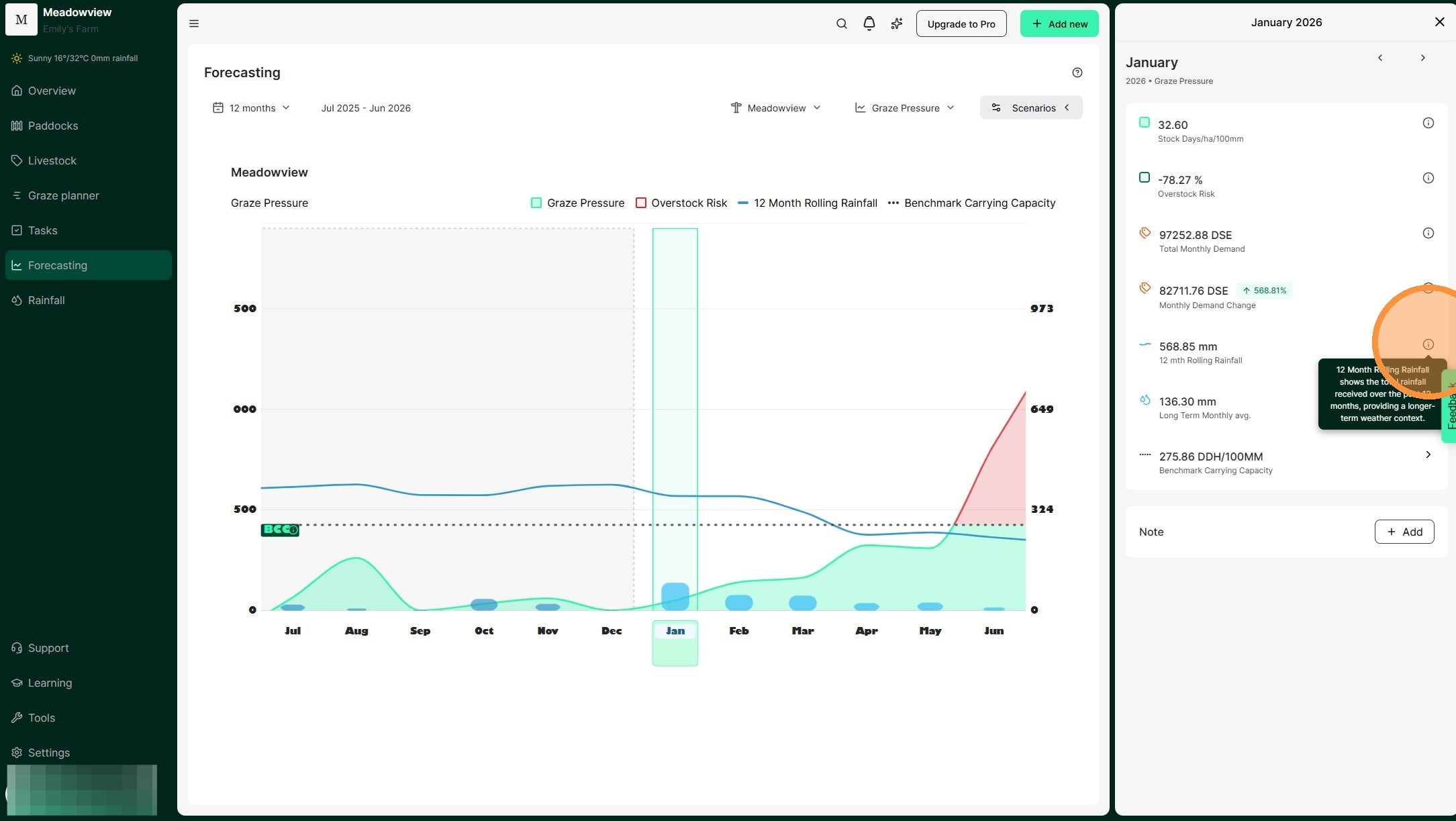 2. This will launch the forecasting graph. This chart represents your grazing pressure and forecasts your predicted grazing pressure given the trending stocking rate, and your long term average rainfall. It also compares your past actuals to help you identify when your land was at risk of stress from potential overstocking. It helps you understand your productivity and grass growth per 100mm or inch of rainfall.