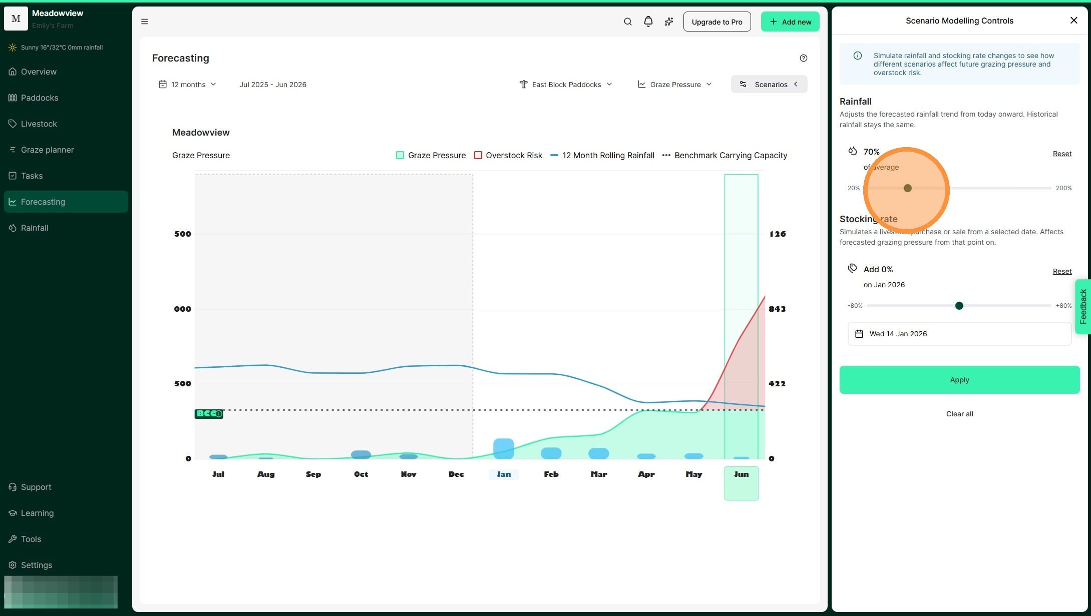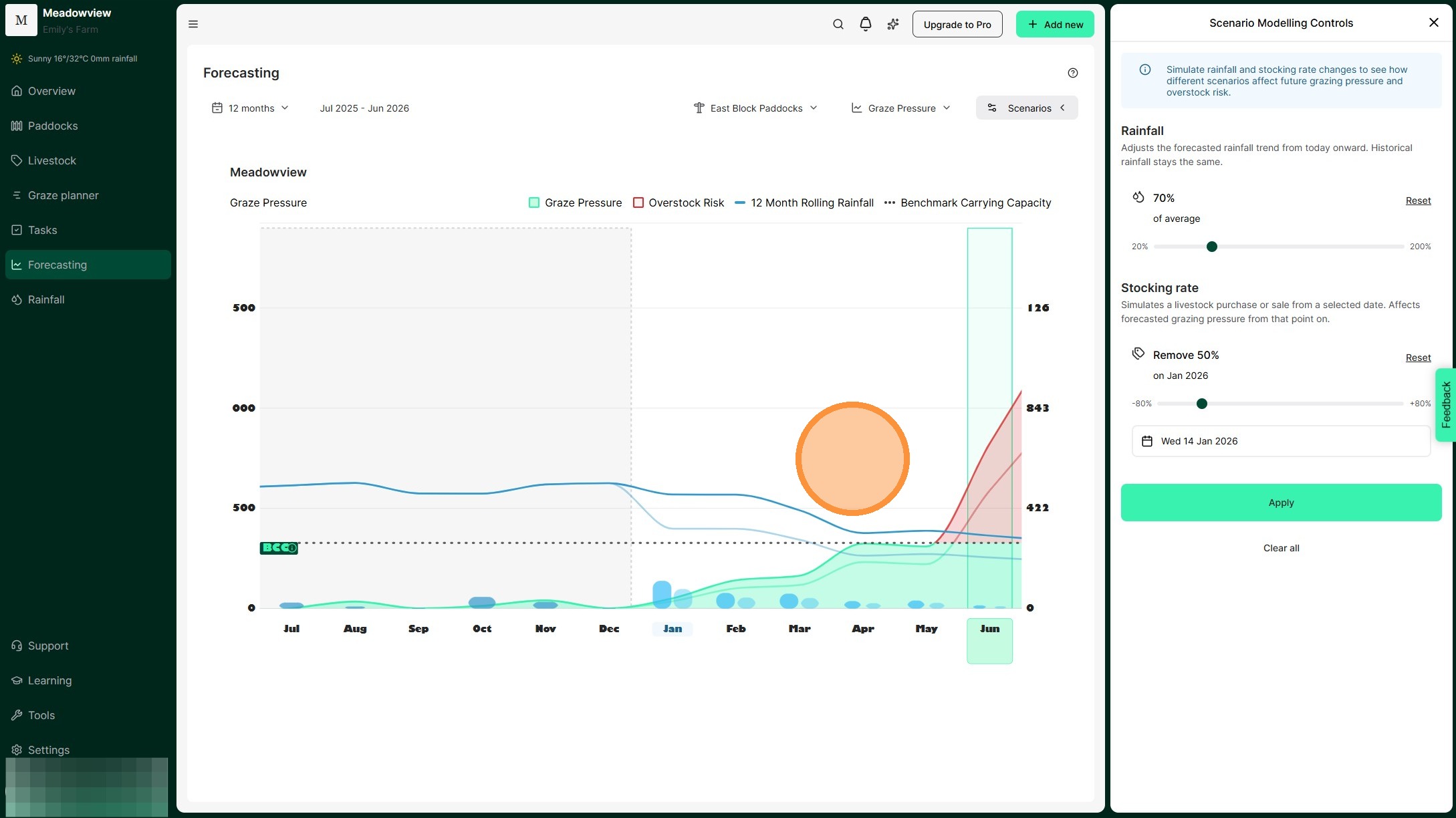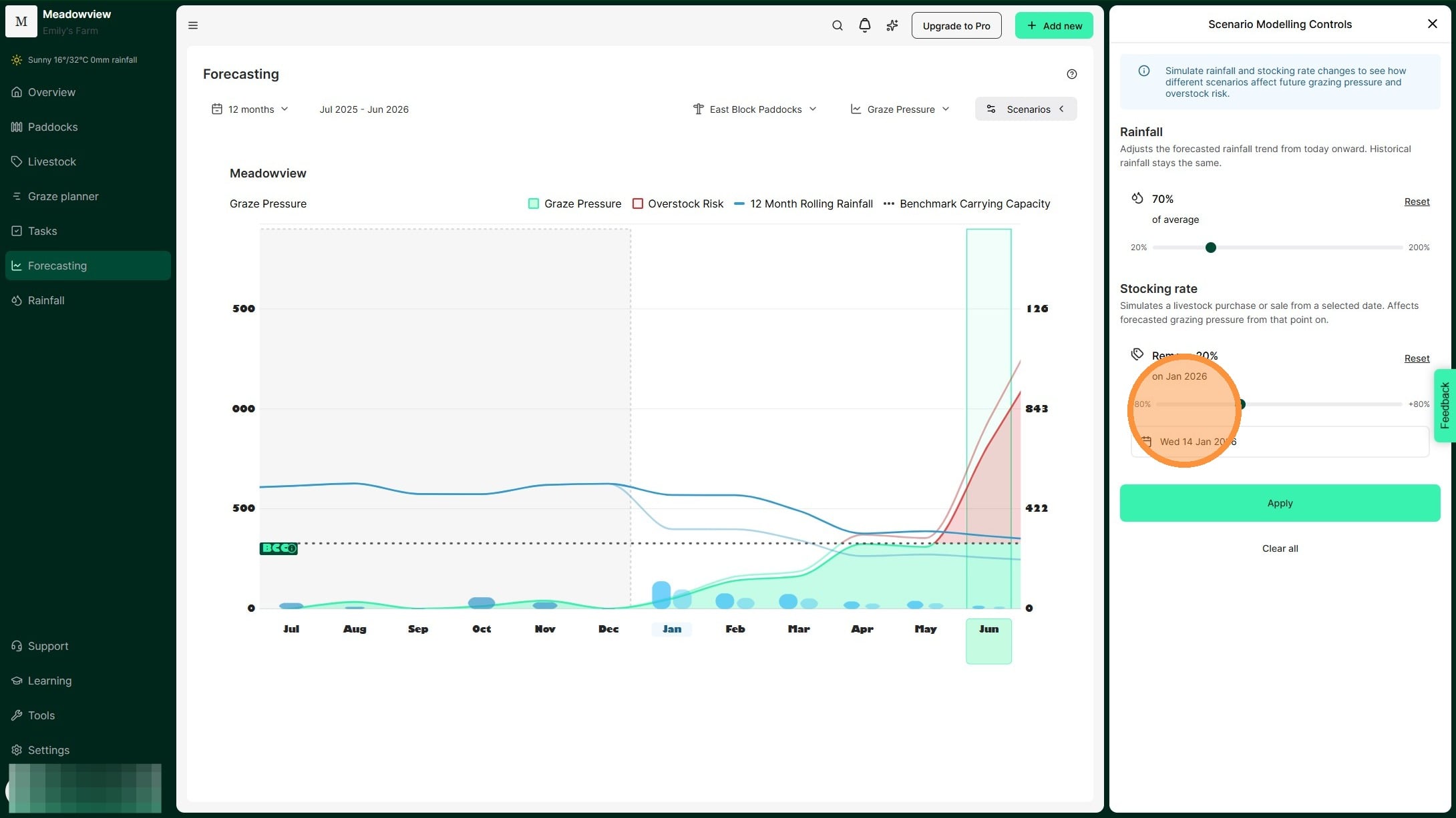 14. Test seasonal scenarios in the Graze Pressure chart by selecting 'Scenarios'. Adjust rainfall and stocking amounts to see how they will affect grazing pressure.