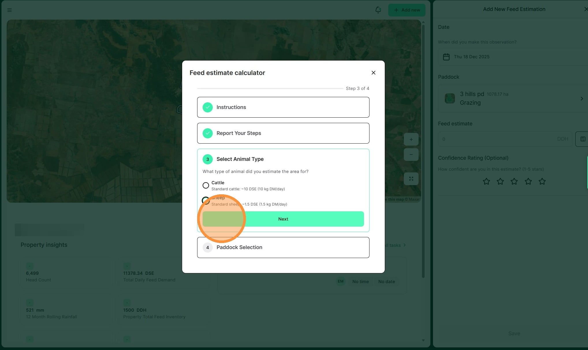 9. Select the relevant animal type you wish to estimate the area for. Then select "Next"