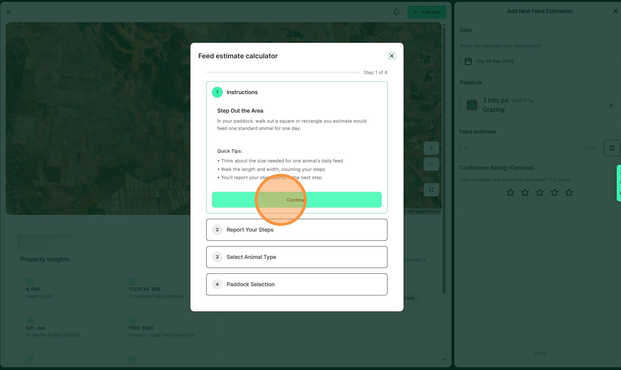 Atlas Grazing provides a step-by-step guide to completing a feed estimation, with the option of two methods. The Single Animal Method involves walking out a square or rectangle you estimate would feed one standard animal for one day. Input the number of steps into Atlas Grazing, and we will calculate the feed availability for the paddock. This allows you to understand how long your mob can graze that paddock and plan when they will need to move