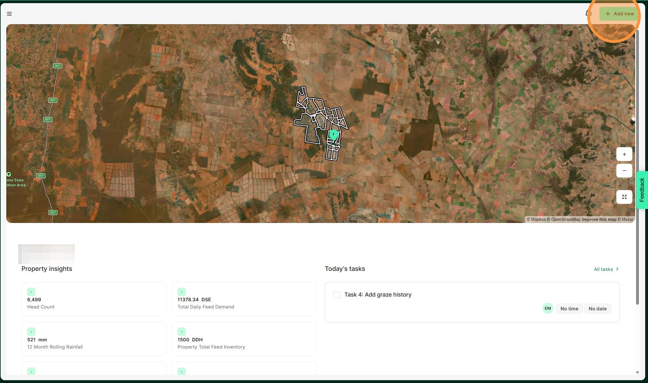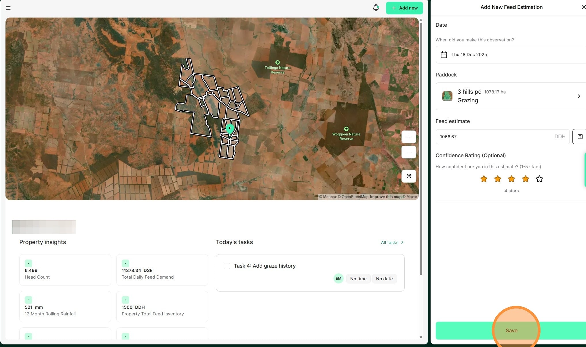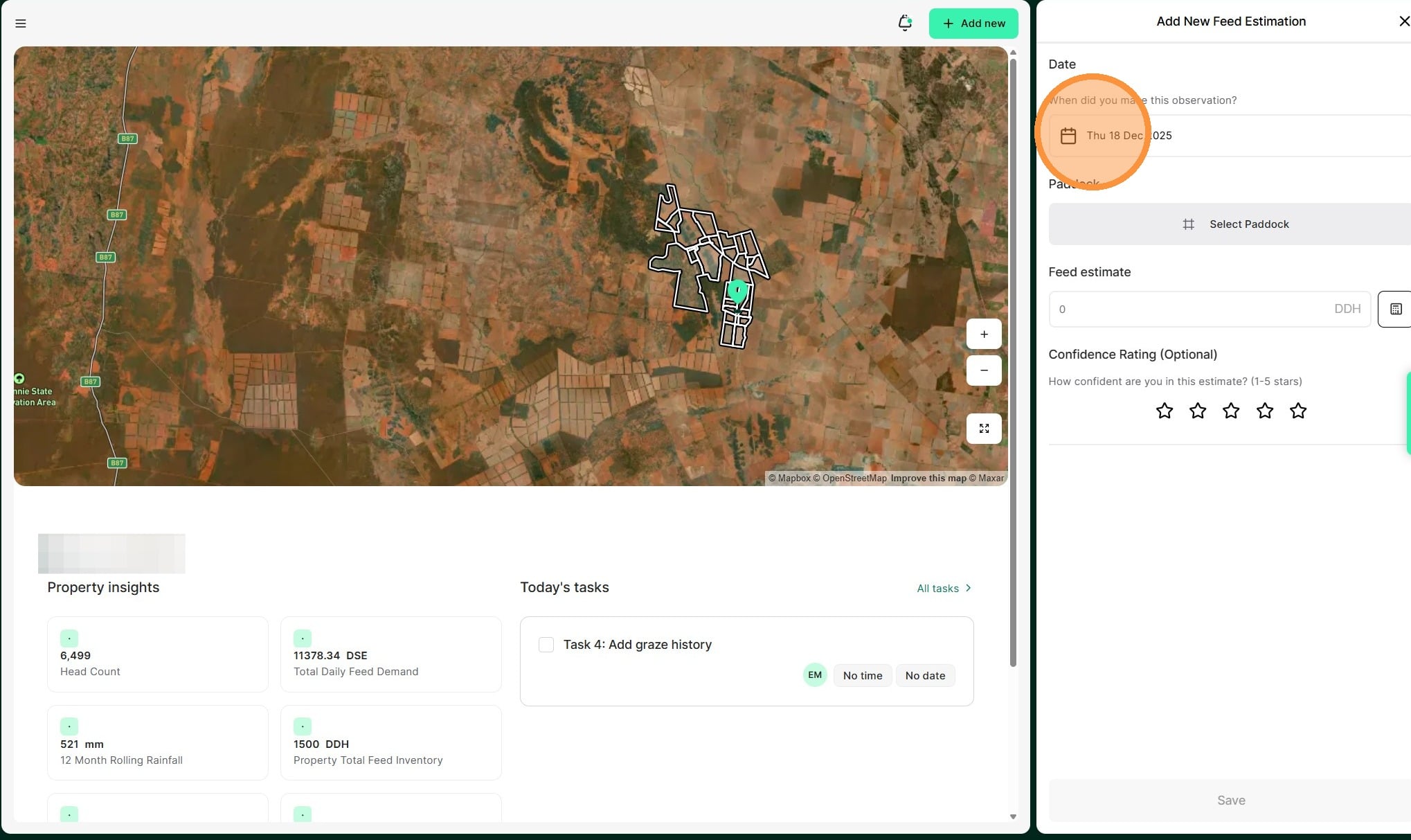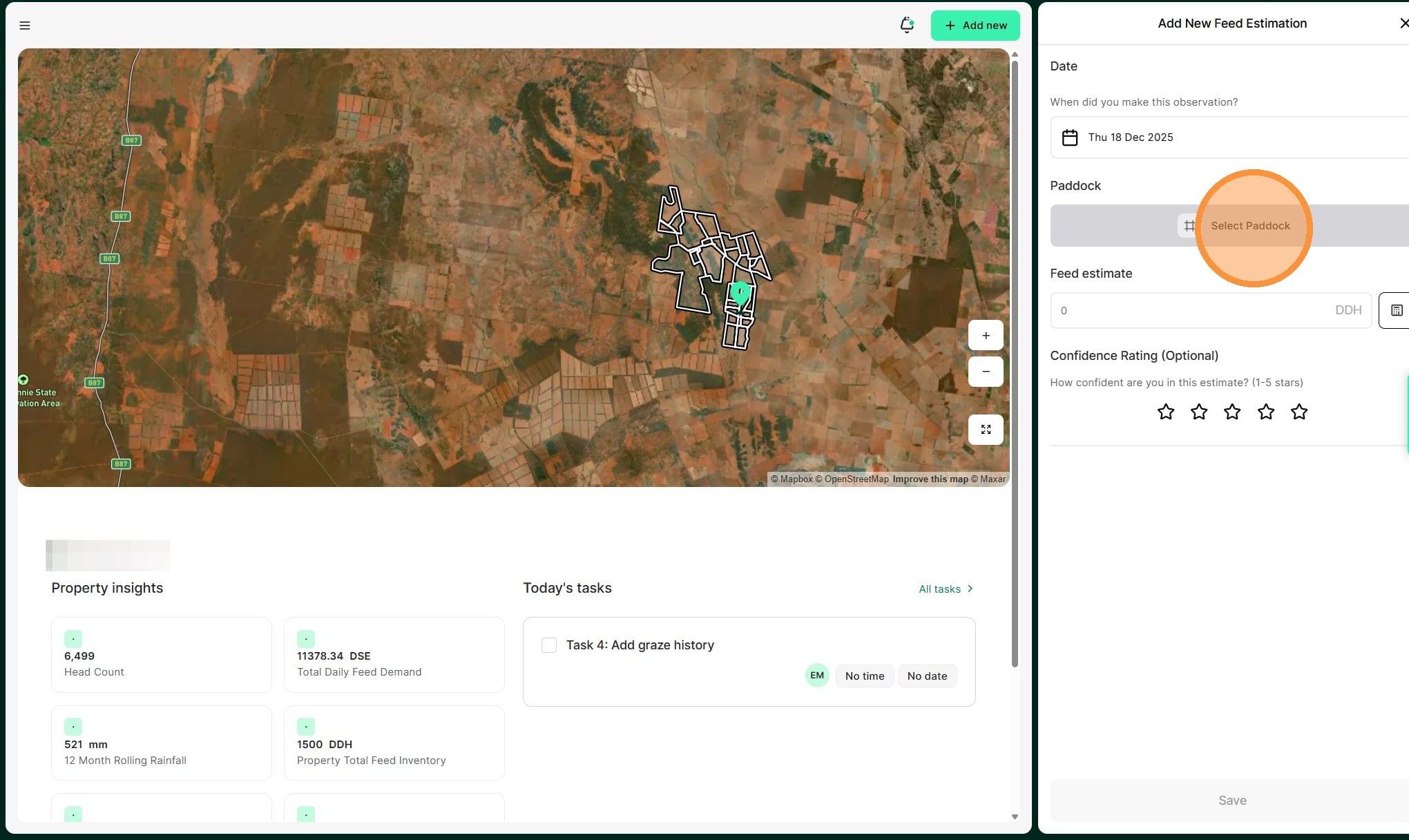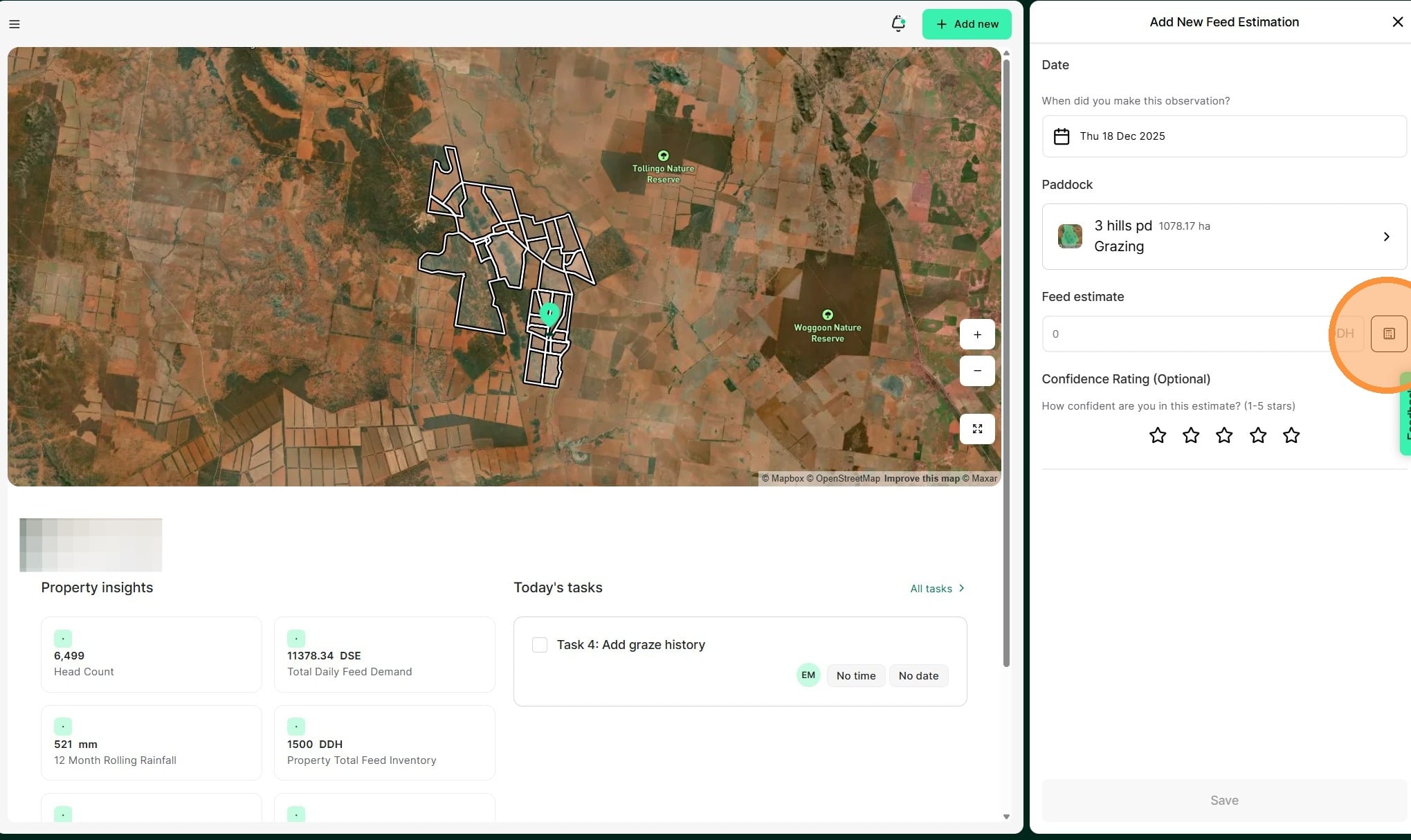 Tip: A feed estimation record allows you to capture the available forage in your paddocks and helps to forecast projected pasture stocks against livestock demand.