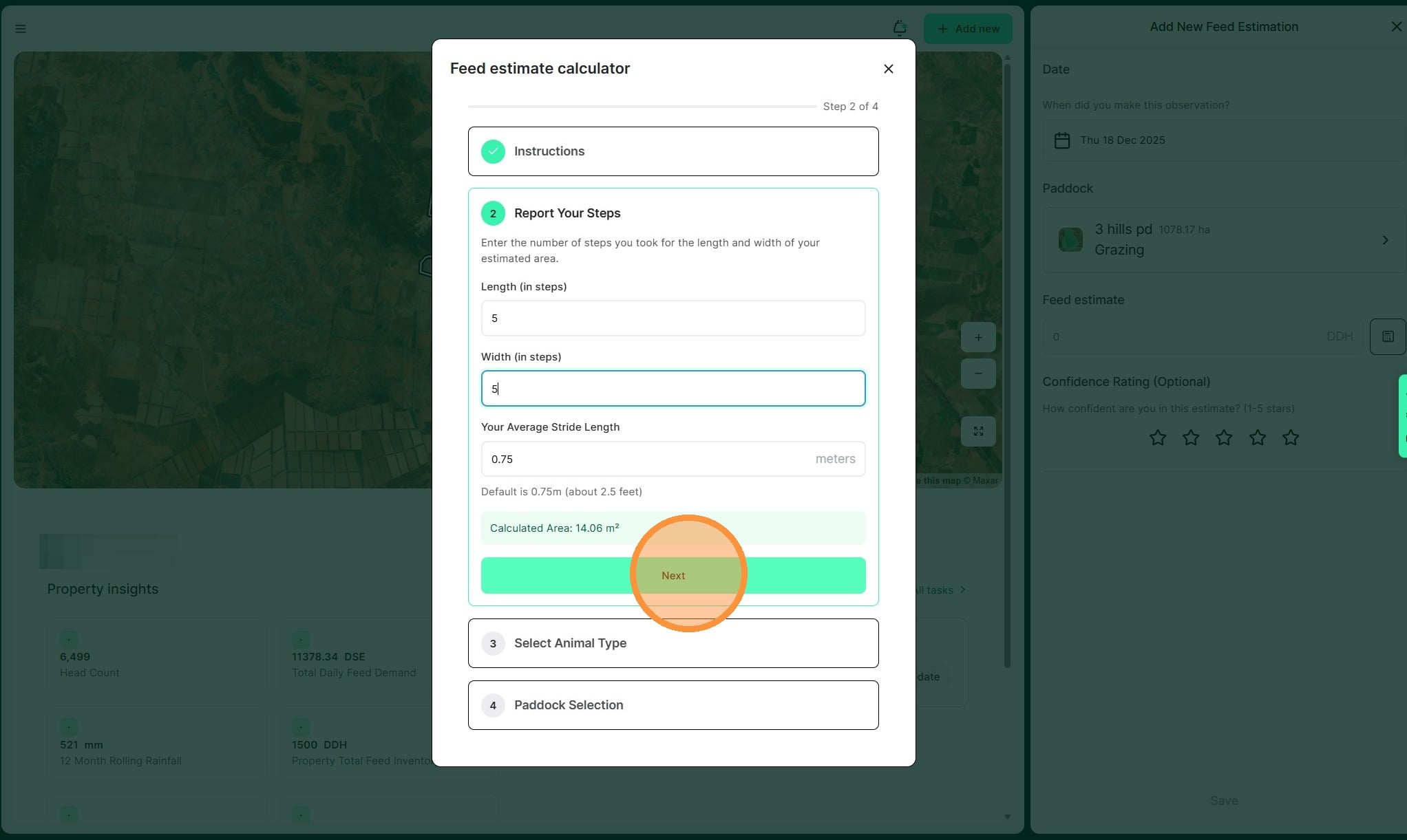 8. Enter the number of steps and your estimate stride length to calculate the total area. Then select "Next"