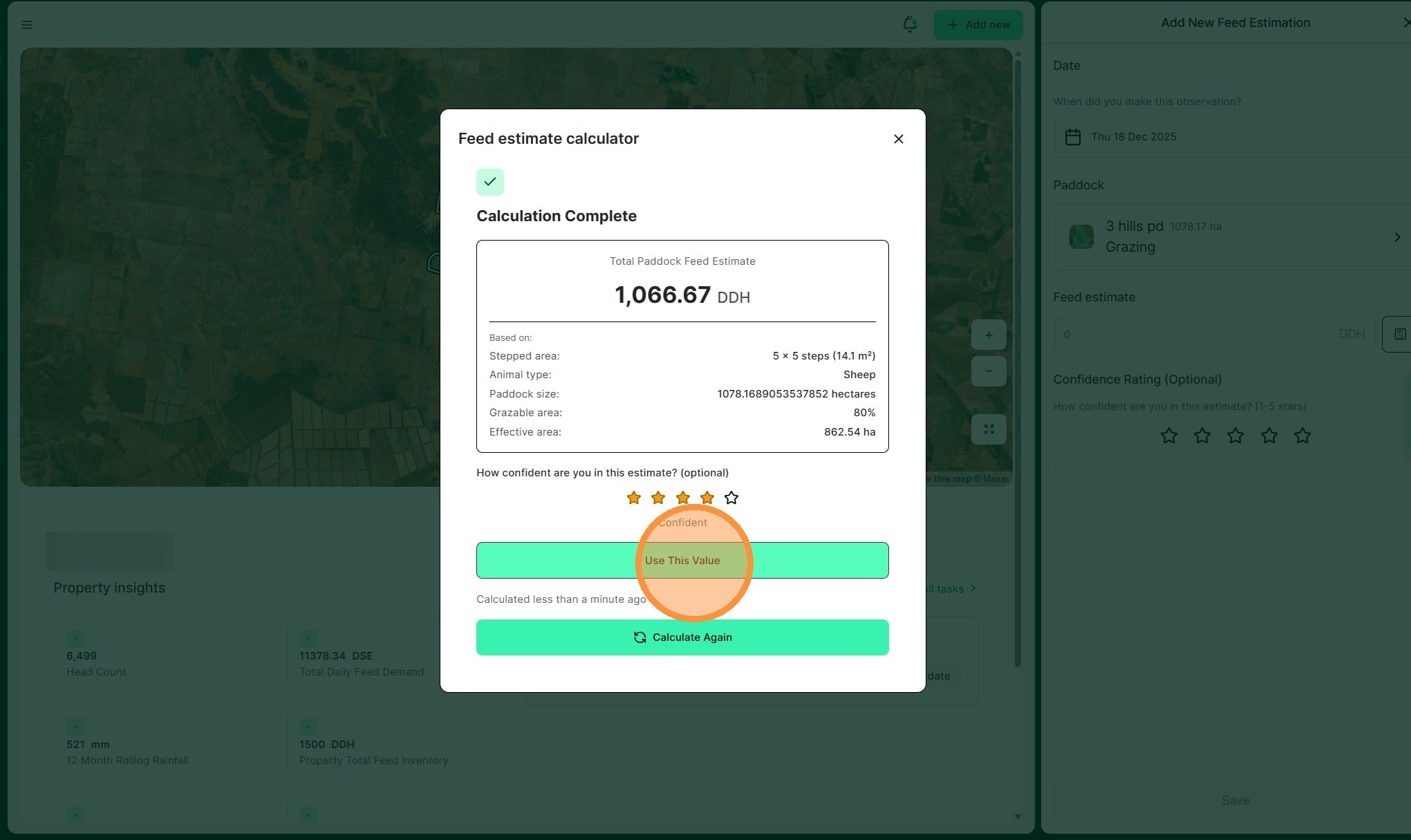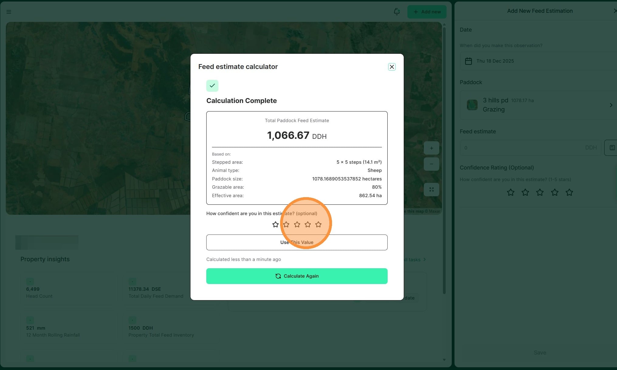 10. Select a paddock and adjust the grazeable area percentage if needed. Then select Calculate Feed Estimate."