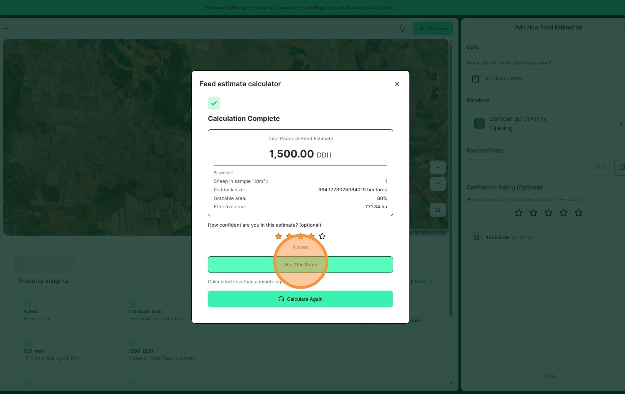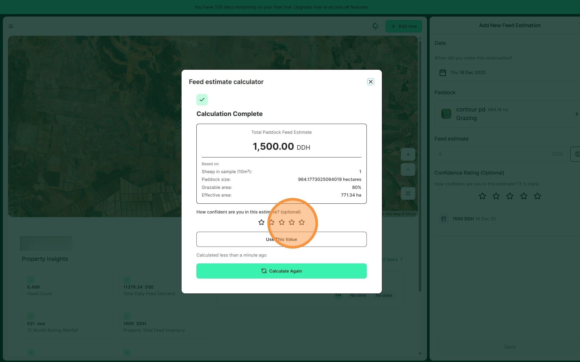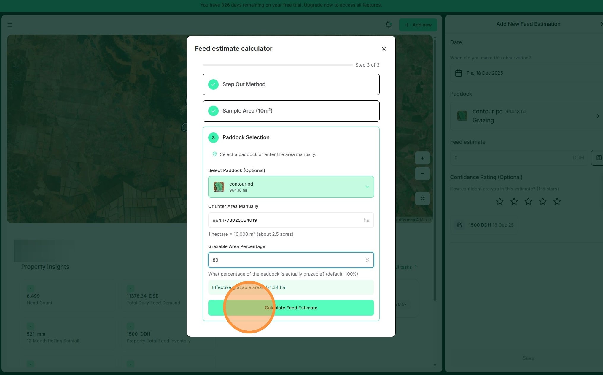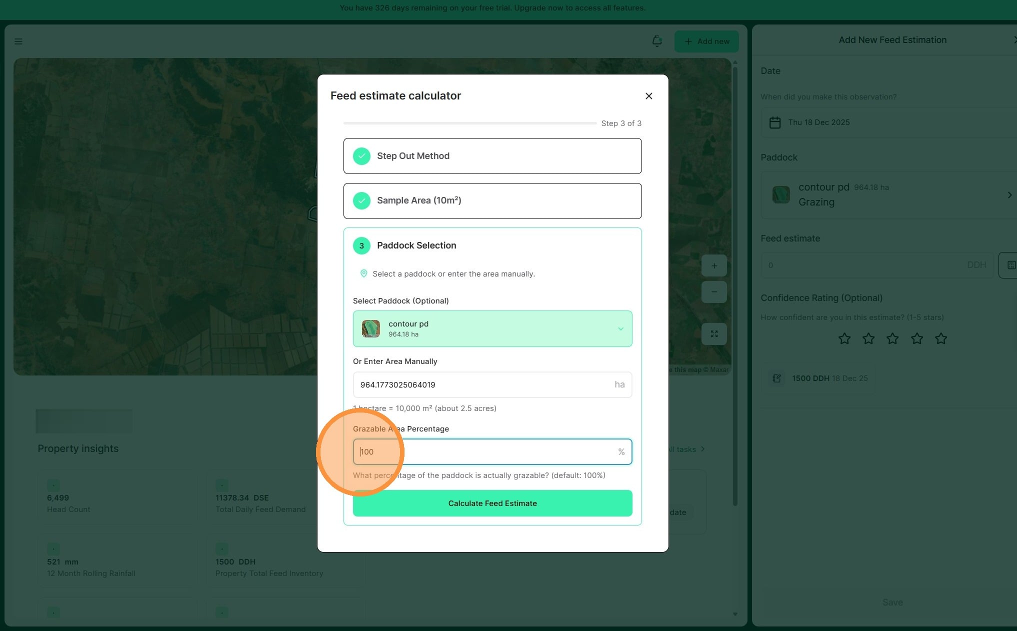 Feed estimations (or budgets) are a way for you to measure the approximate forage availability of a paddock and plan the length of a graze. Recording feed estimations in Atlas Grazing allows you to improve the accuracy of your assessments by comparing your estimation to the actual graze yield. Over time, your visual feed estimations get more accurate, allowing you to make more confident decisions in the paddock.