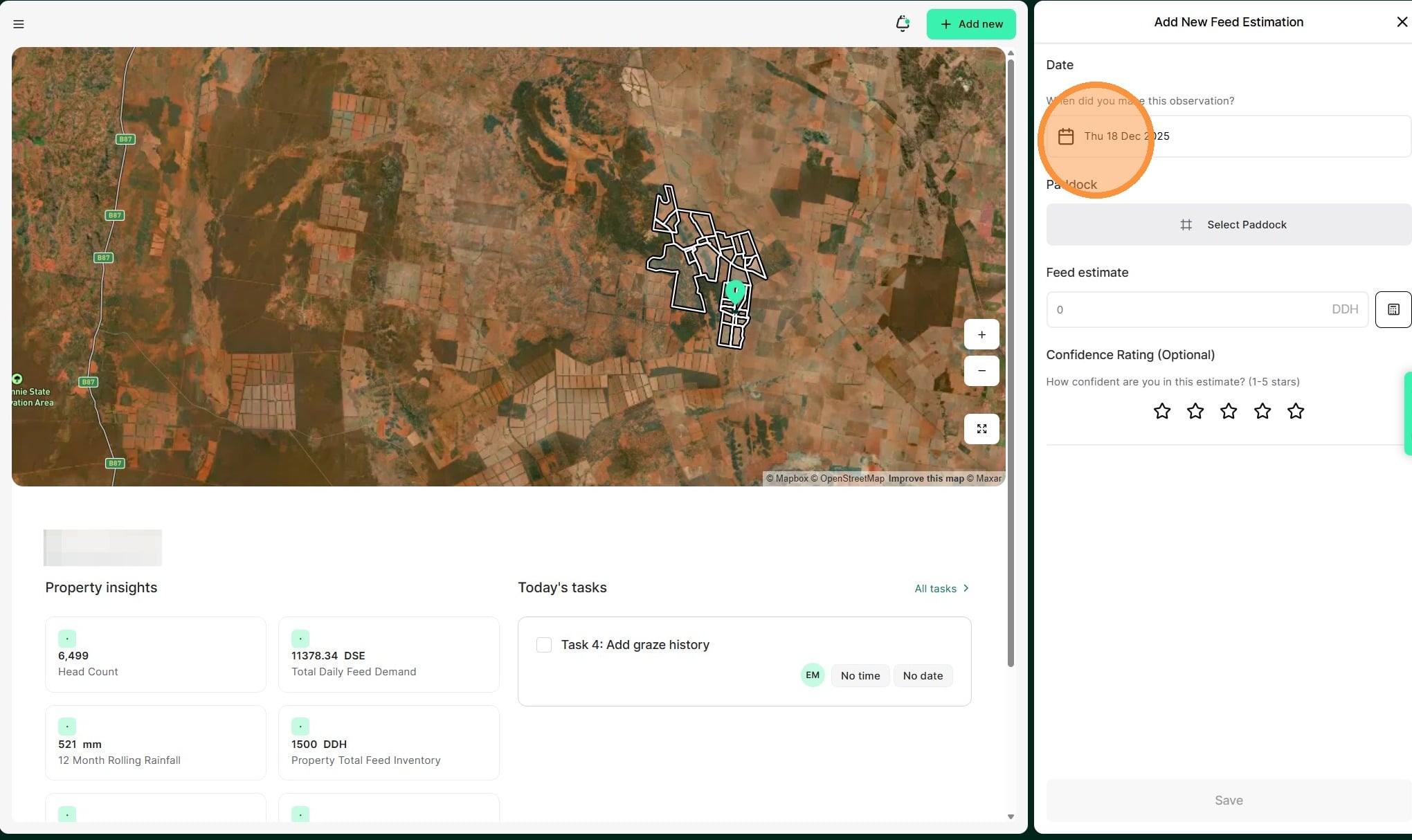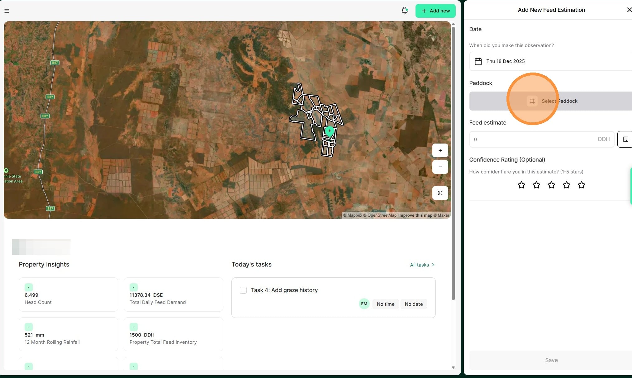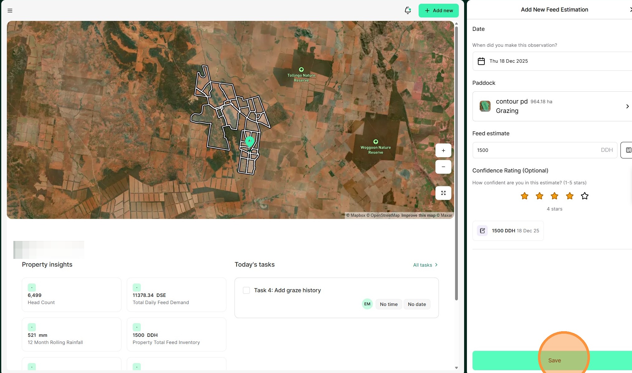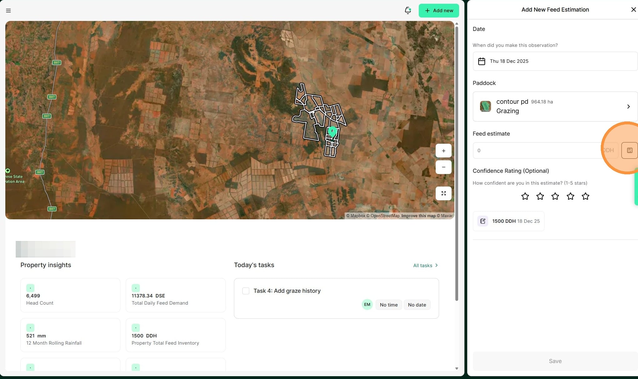 Tip: A feed estimation record allows you to capture the available forage in your paddocks and helps to forecast projected pasture stocks against livestock demand.