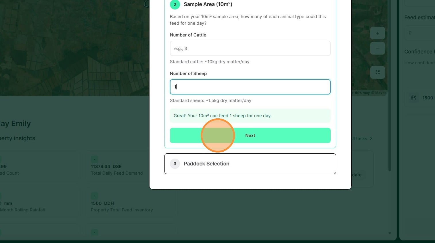8. Enter the number of sheep and/or cattle. Then select "Next"