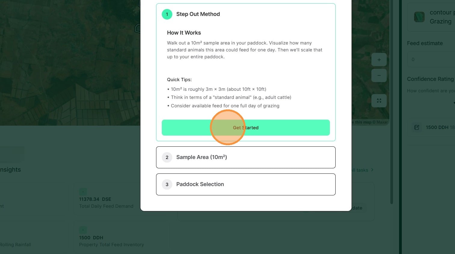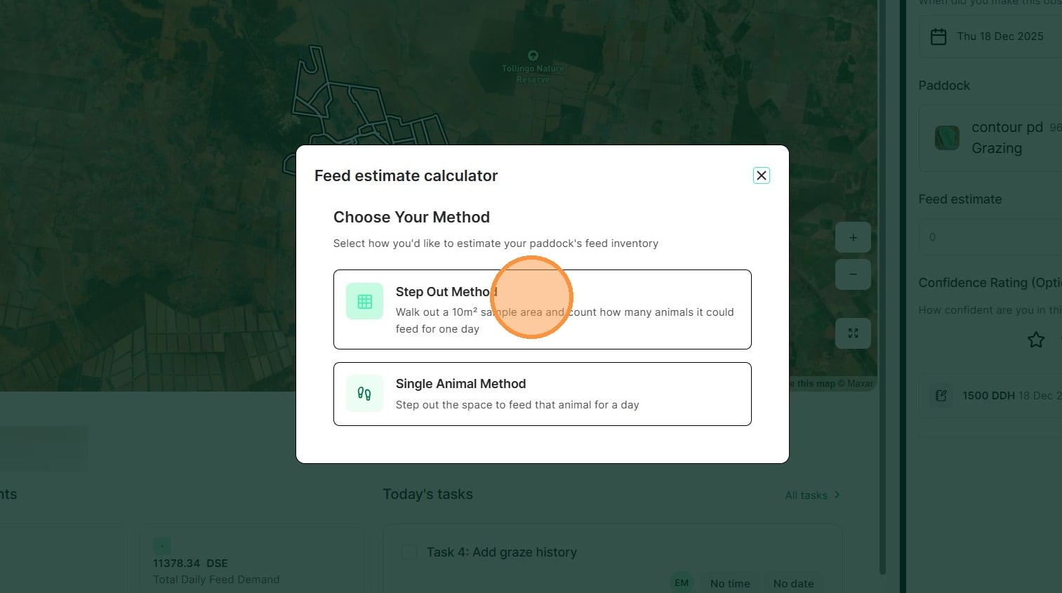 Atlas Grazing provides a step-by-step guide to completing a feed estimation, with the option of two methods. The Step Out Method involves visualising how many standard animals a 3mx3m square could feed for one day. Then we'll scale that up to your entire paddock. This allows you to understand how long your mob can graze that paddock and plan when they will need to move.