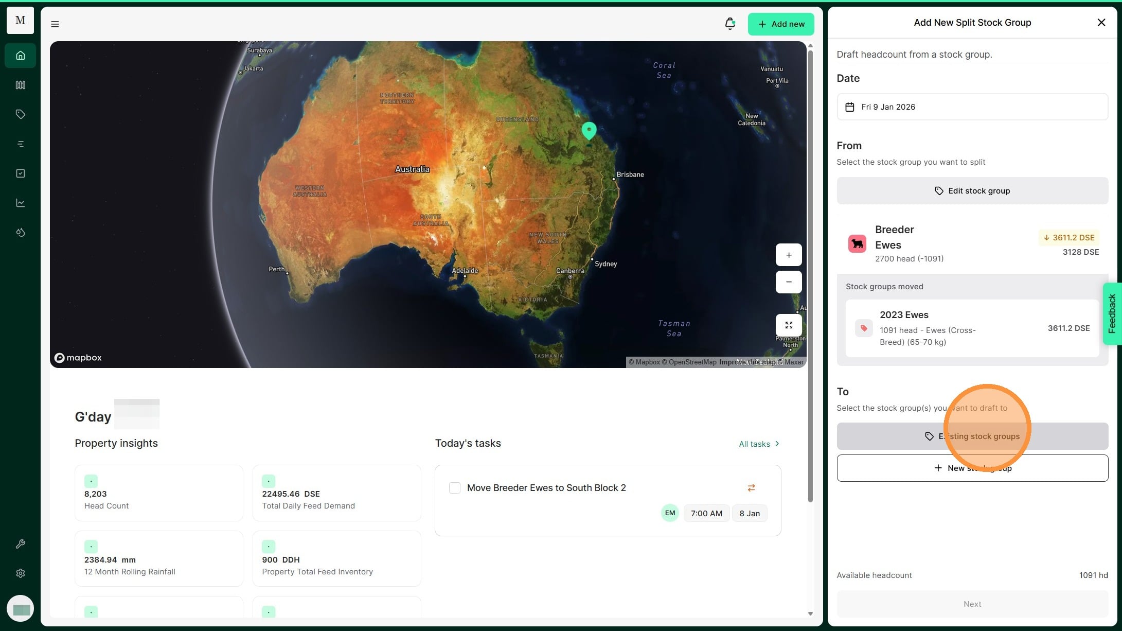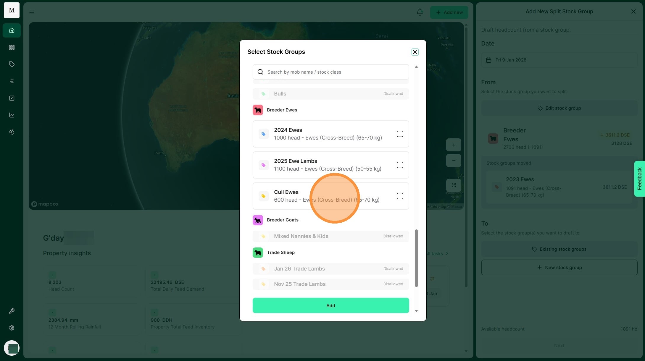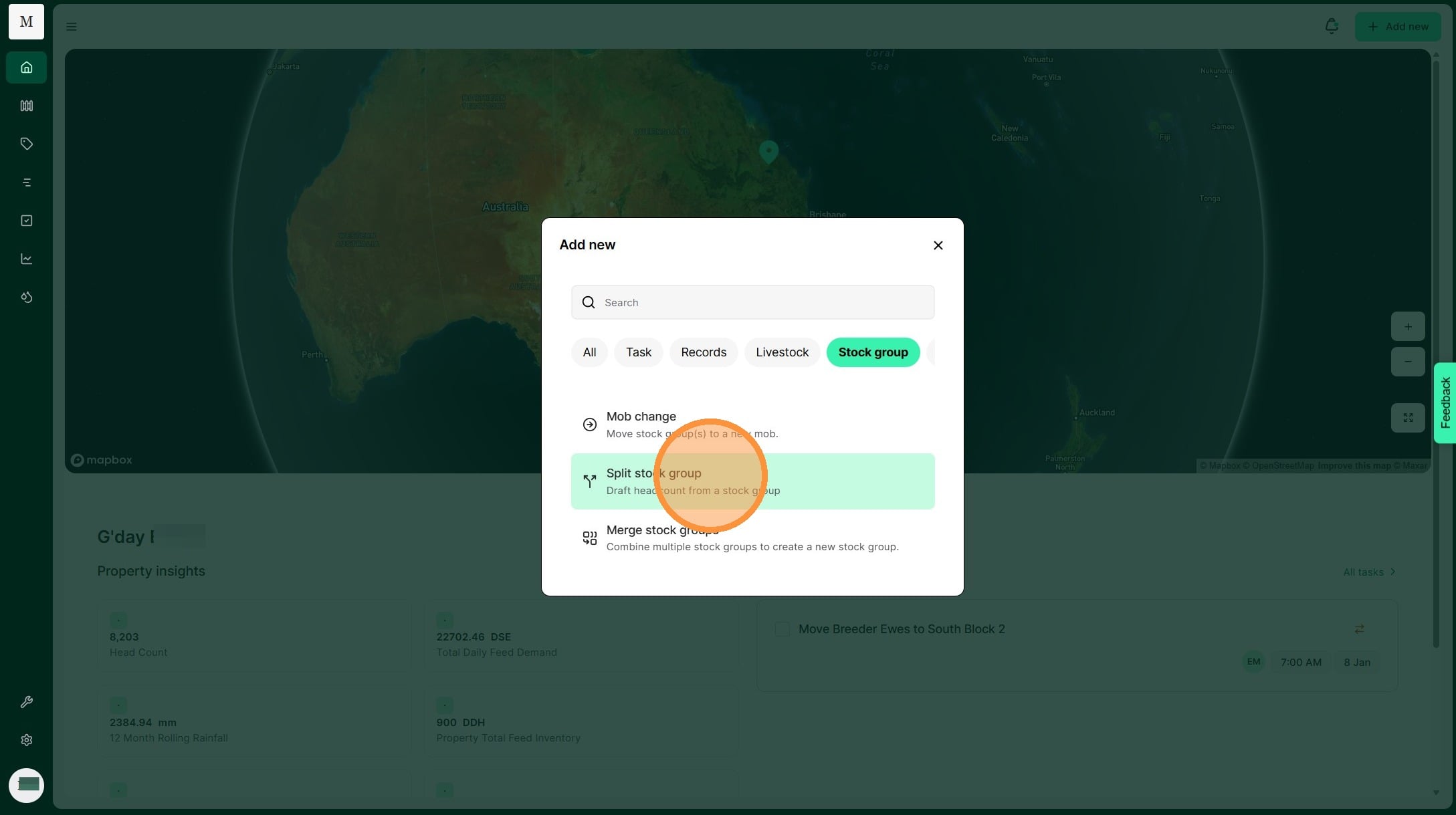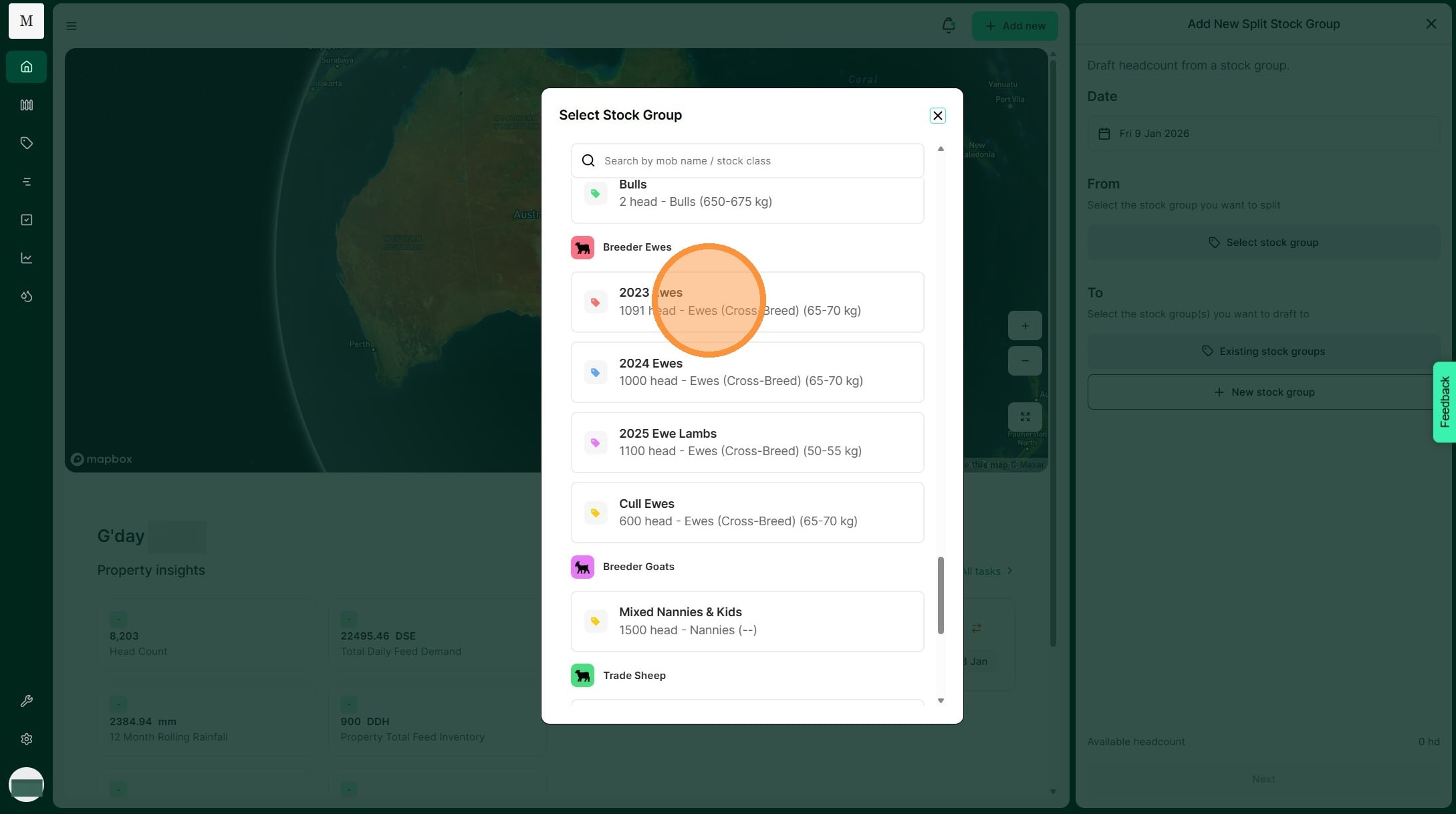 Atlas Grazing makes it fast and simple to keep track of stock groups and mobs. Use a Split Record when you have one stock group that you need to divide to many stock groups. For example, you may cull and draft out some of your 2024 Ewes to sell. You can split them out into your Cull Ewes stock group. This allows you to keep your livestock inventory accurate.