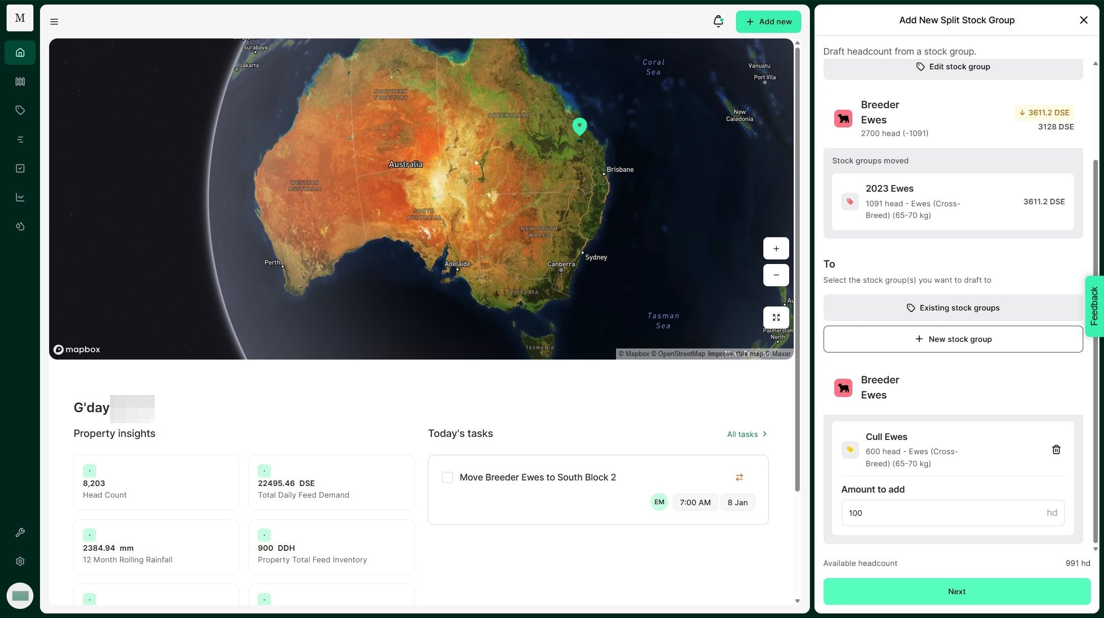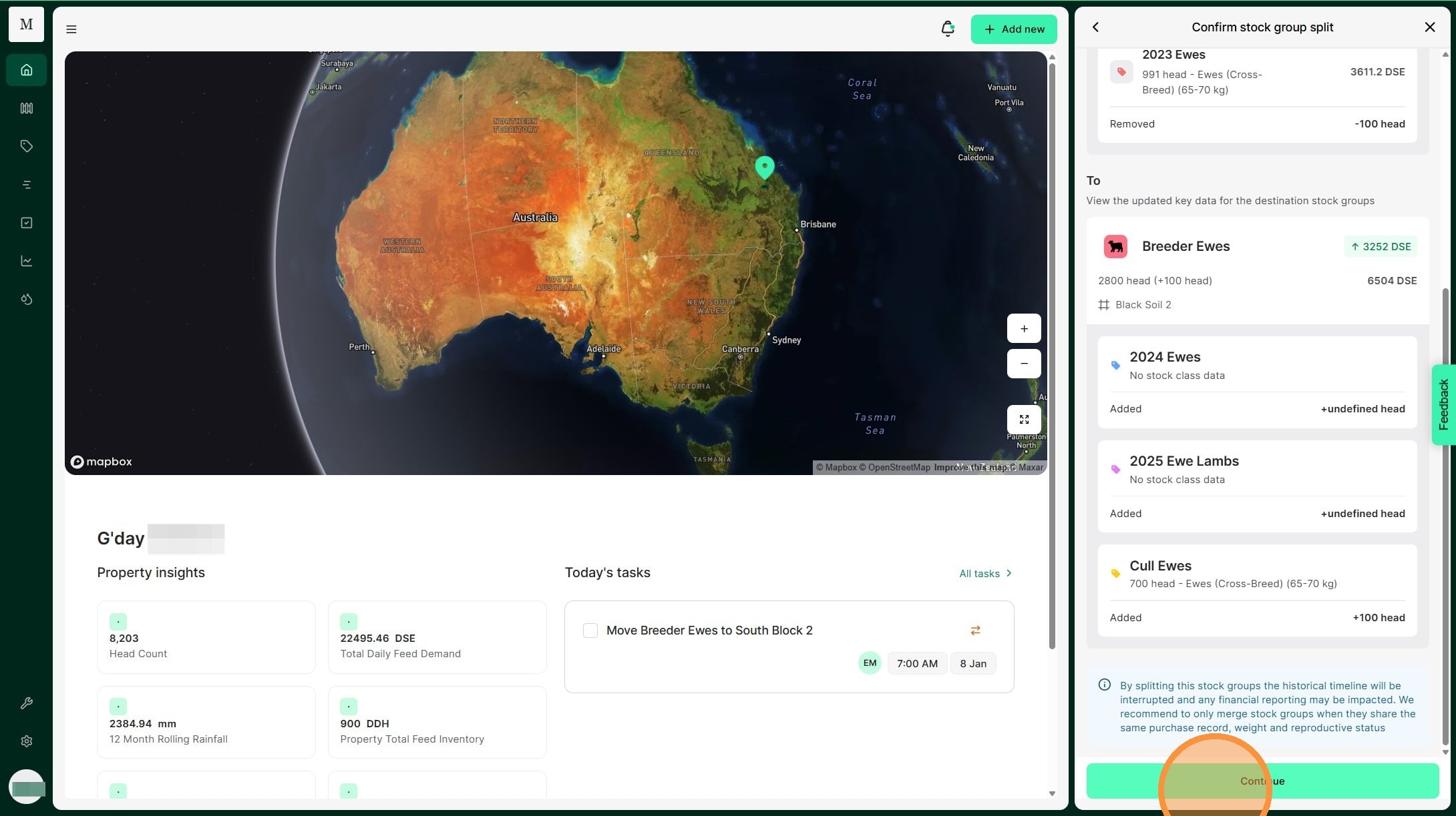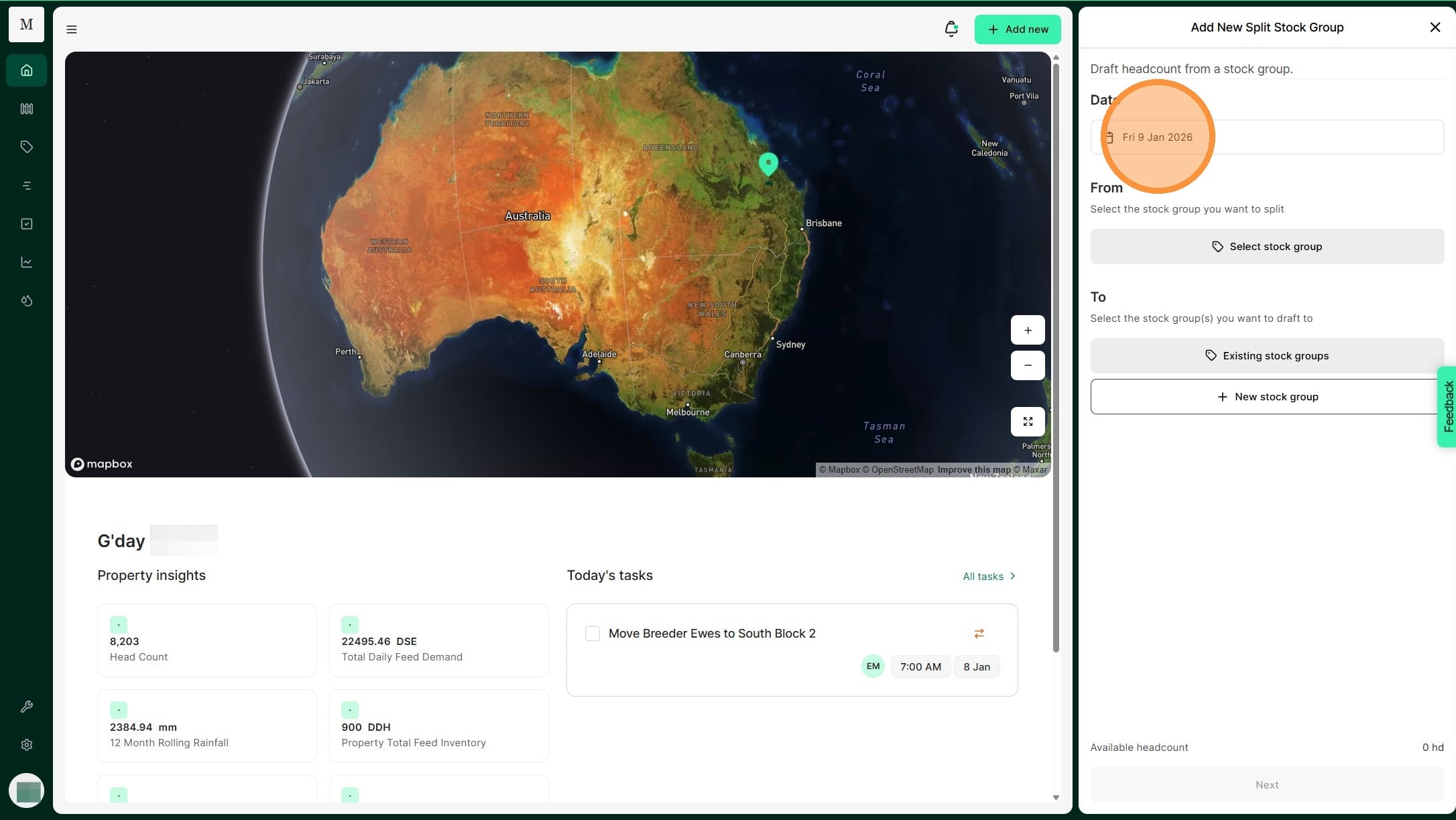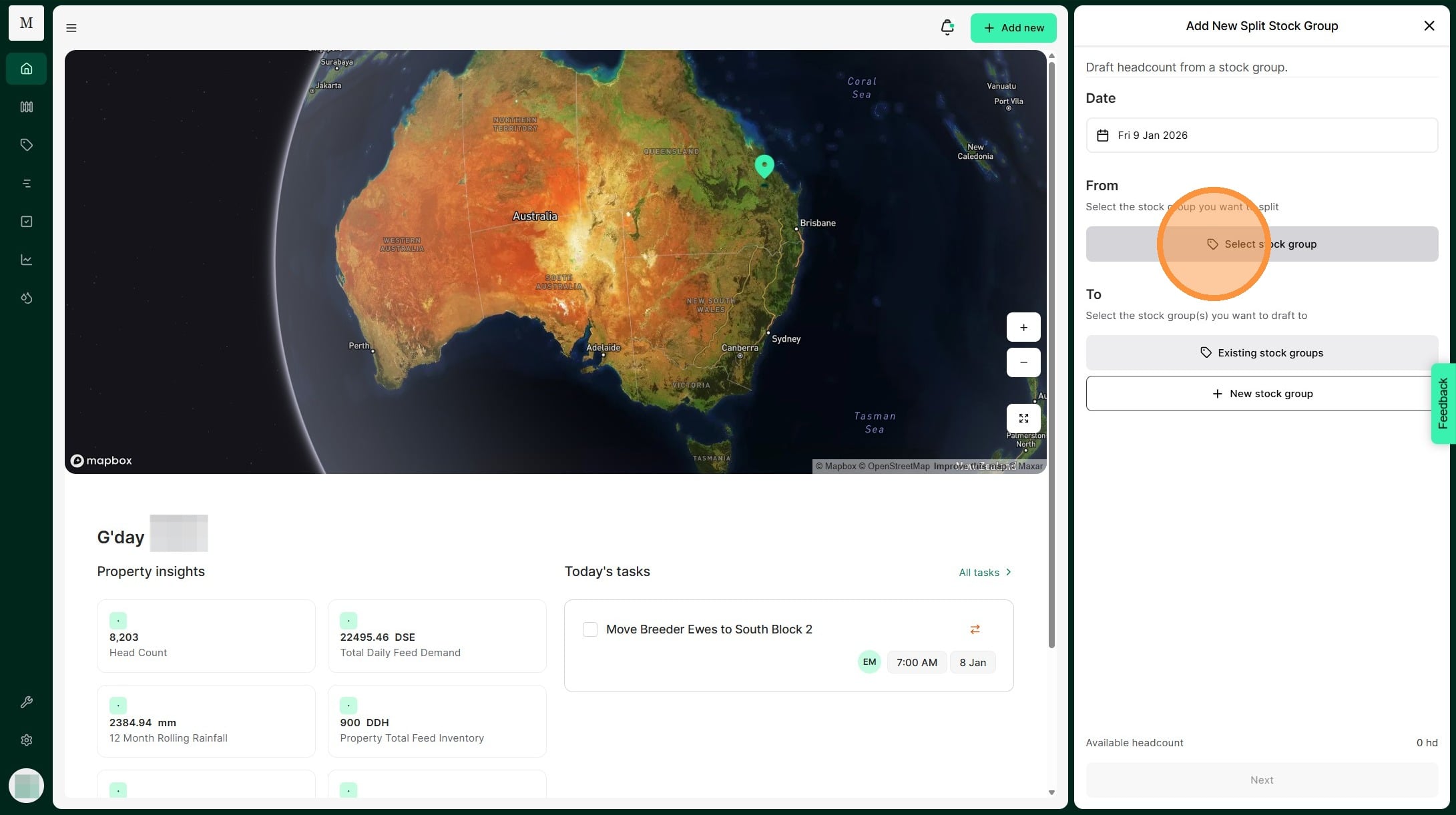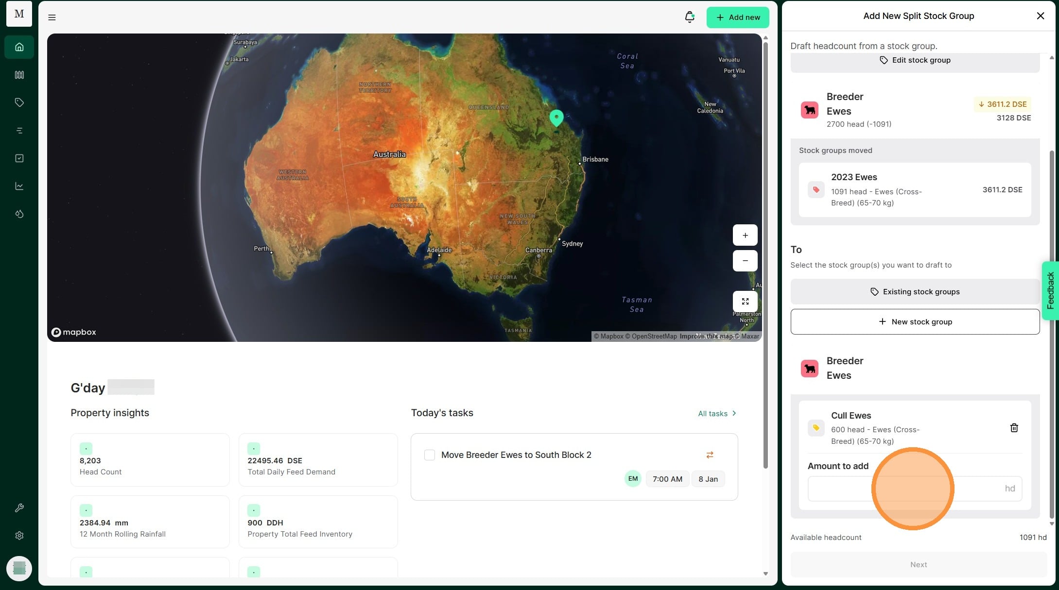 Atlas Grazing makes it fast and simple to keep track of stock groups and mobs. Use a Split Record when you have one stock group that you need to divide to many stock groups. For example, you may cull and draft out some of your 2024 Ewes to sell. You can split them out into your Cull Ewes stock group. This allows you to keep your livestock inventory accurate.