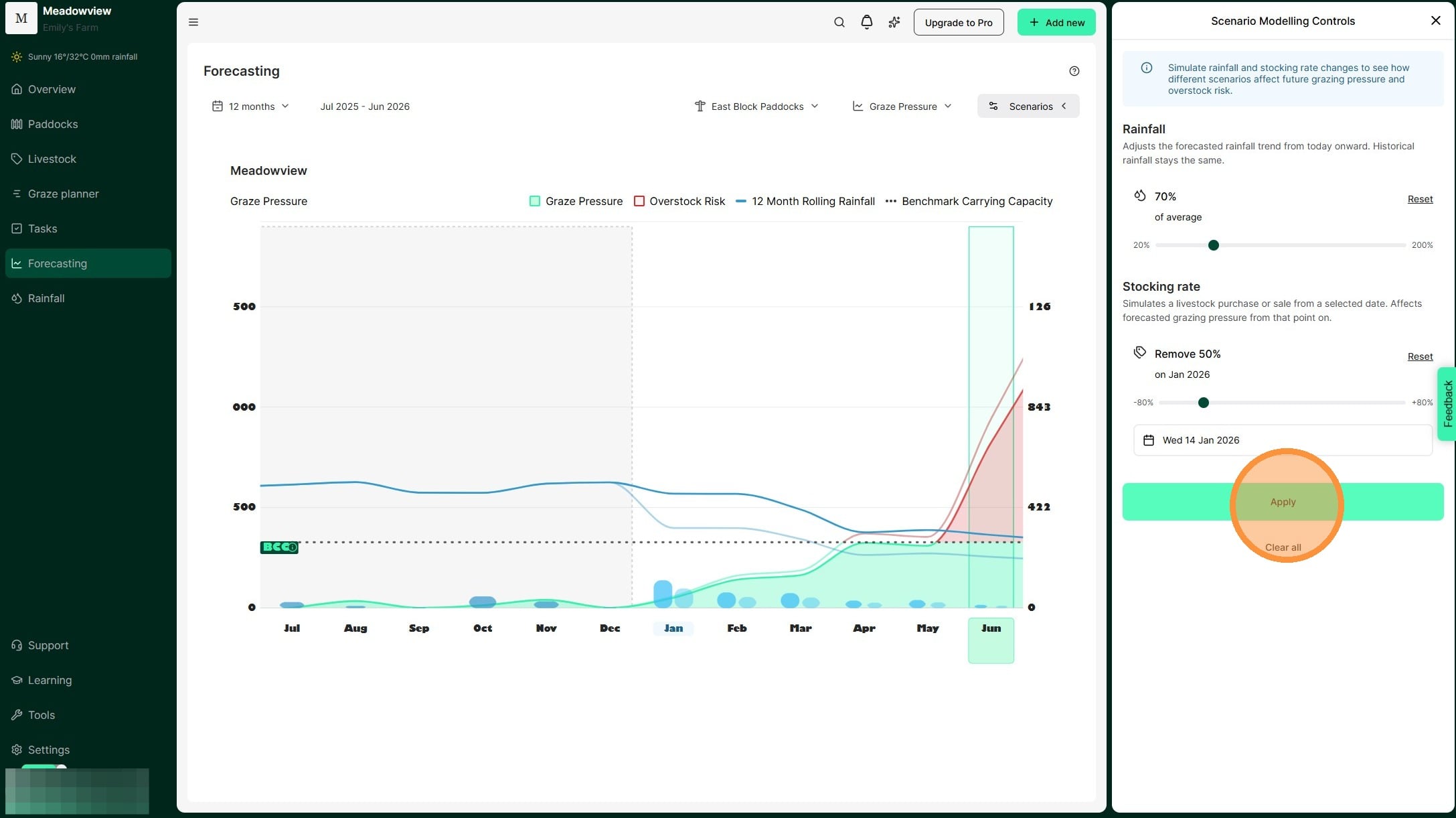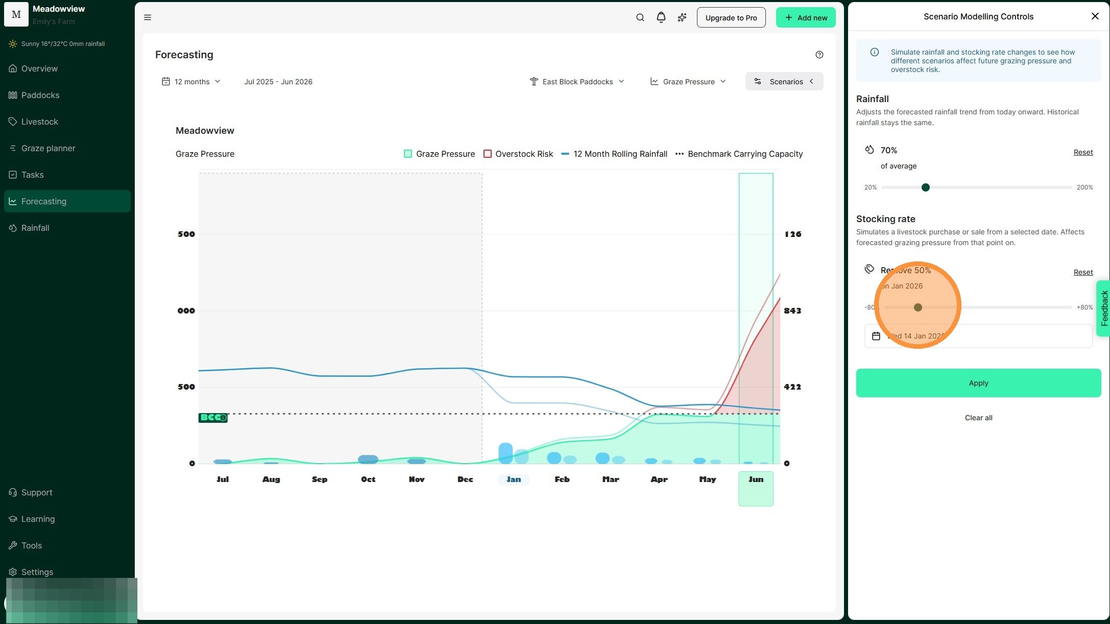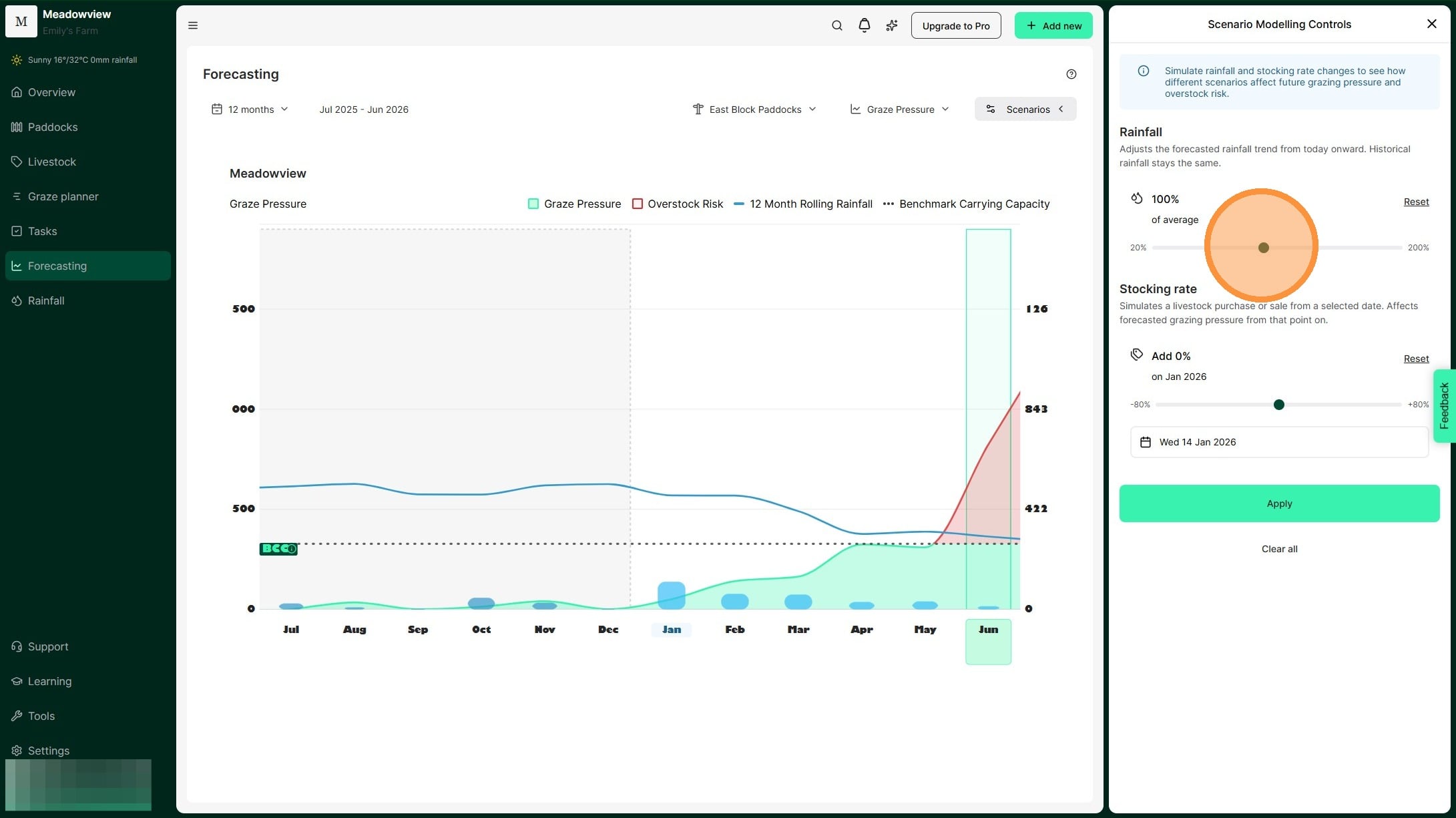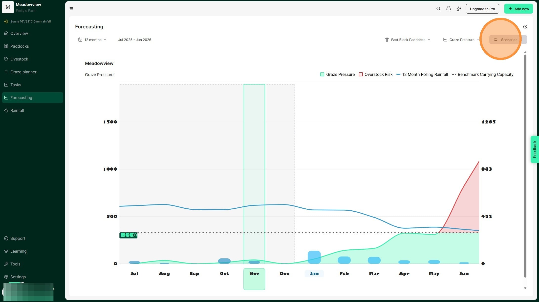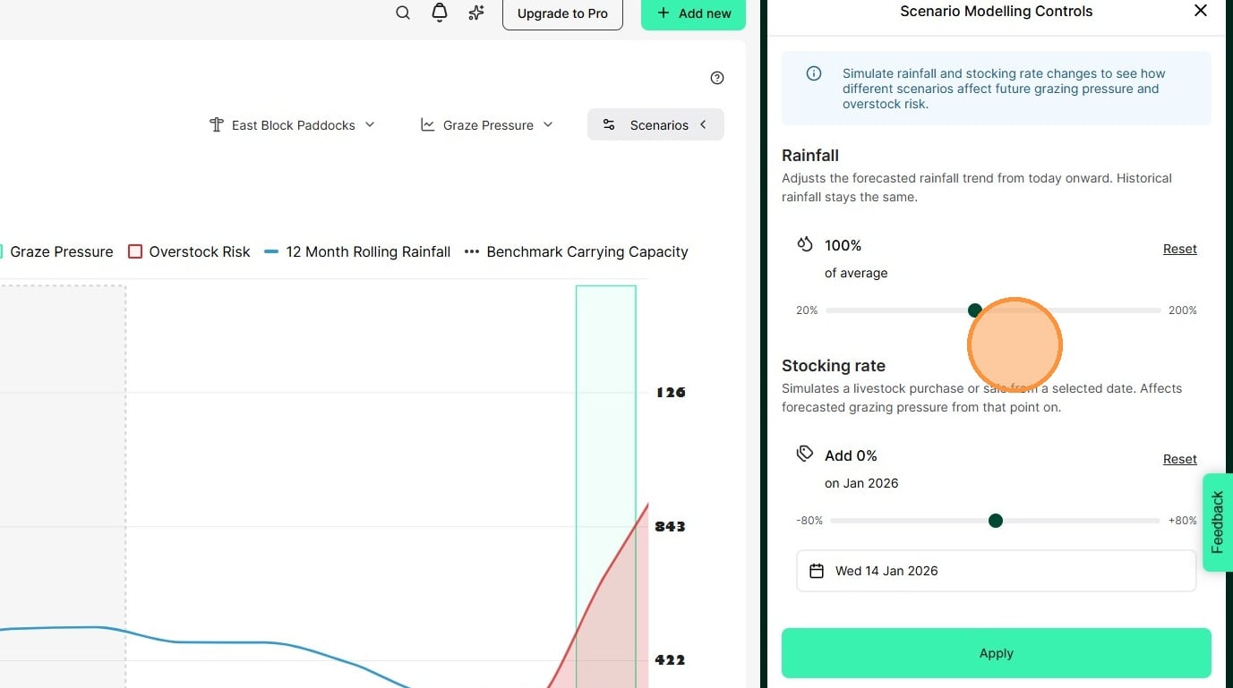1. Test seasonal scenarios in the Graze Pressure chart by selecting 'Scenarios'. Adjust rainfall and stocking amounts to see how they will affect grazing pressure.